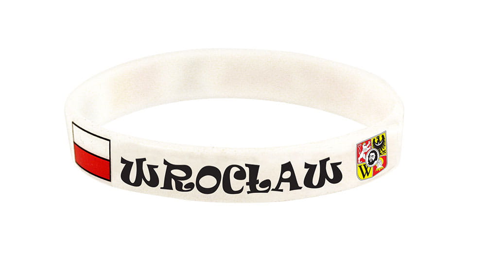 Biała silikonowa bransoletka z napisem Wrocław, godłem oraz flagą Polski