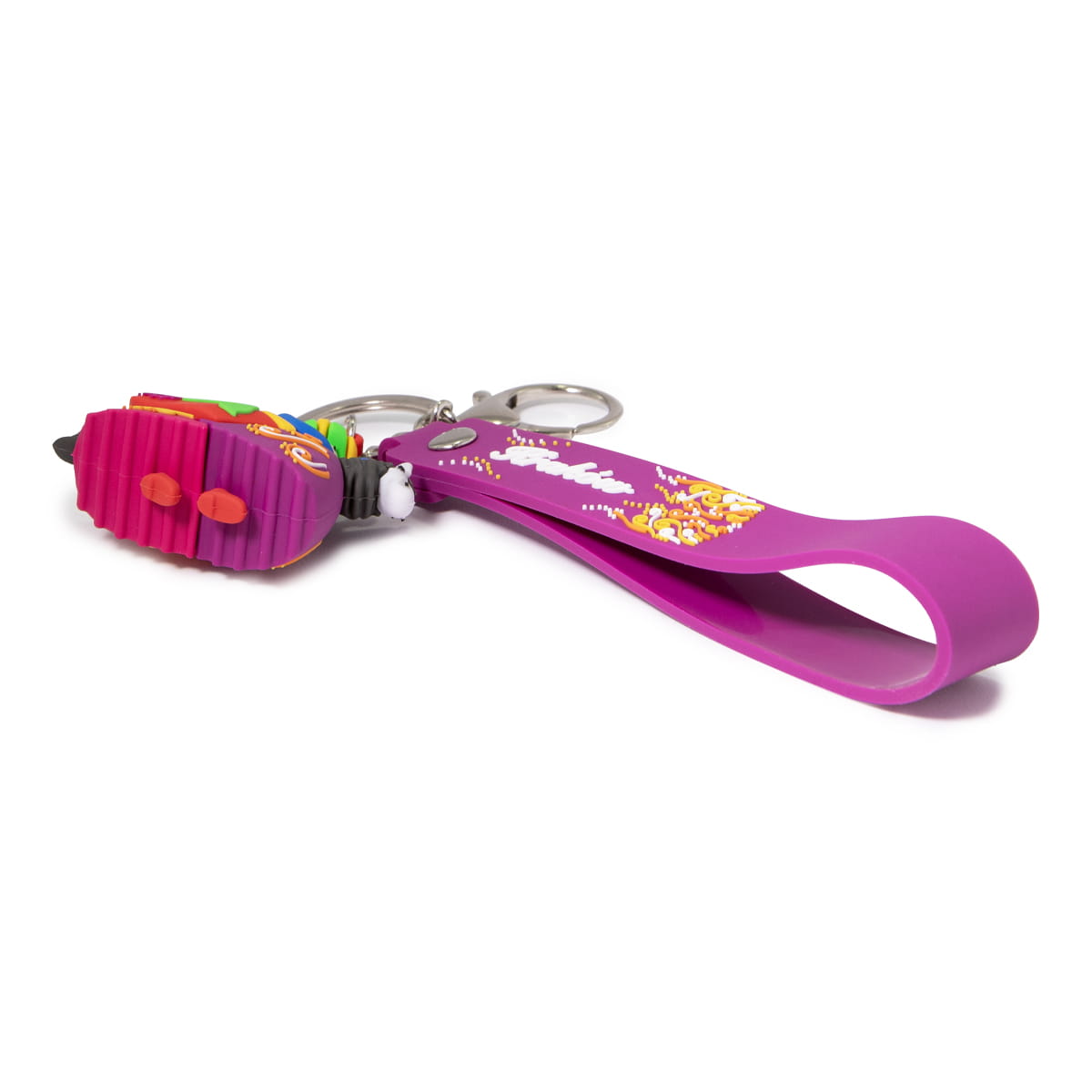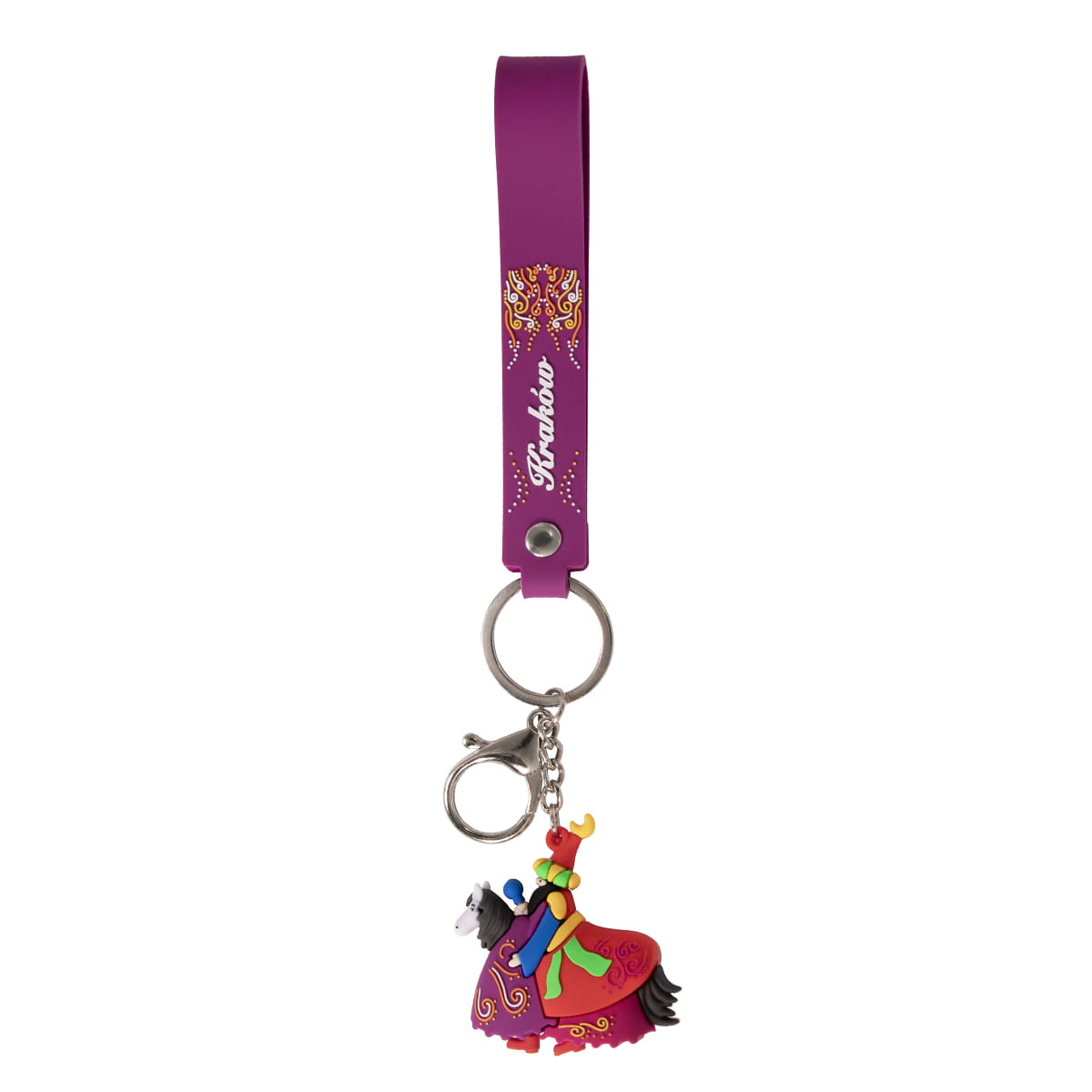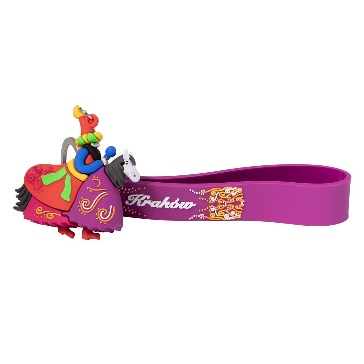 Elegancki, kolorowy, gumowy brelok z figurką lajkonika. Brelok posiada wysokiej jakości niklowane oczko i karabińczyk do zaczepienia kluczy. Fioletowa opaska z napisem "Kraków", o długości 12cm, posiada również wypukłą grafiką prezentującą wzór w charakterystyce mierzącej 5cm postaci prezentowanej przez figurkę.