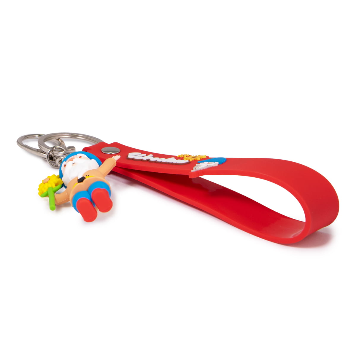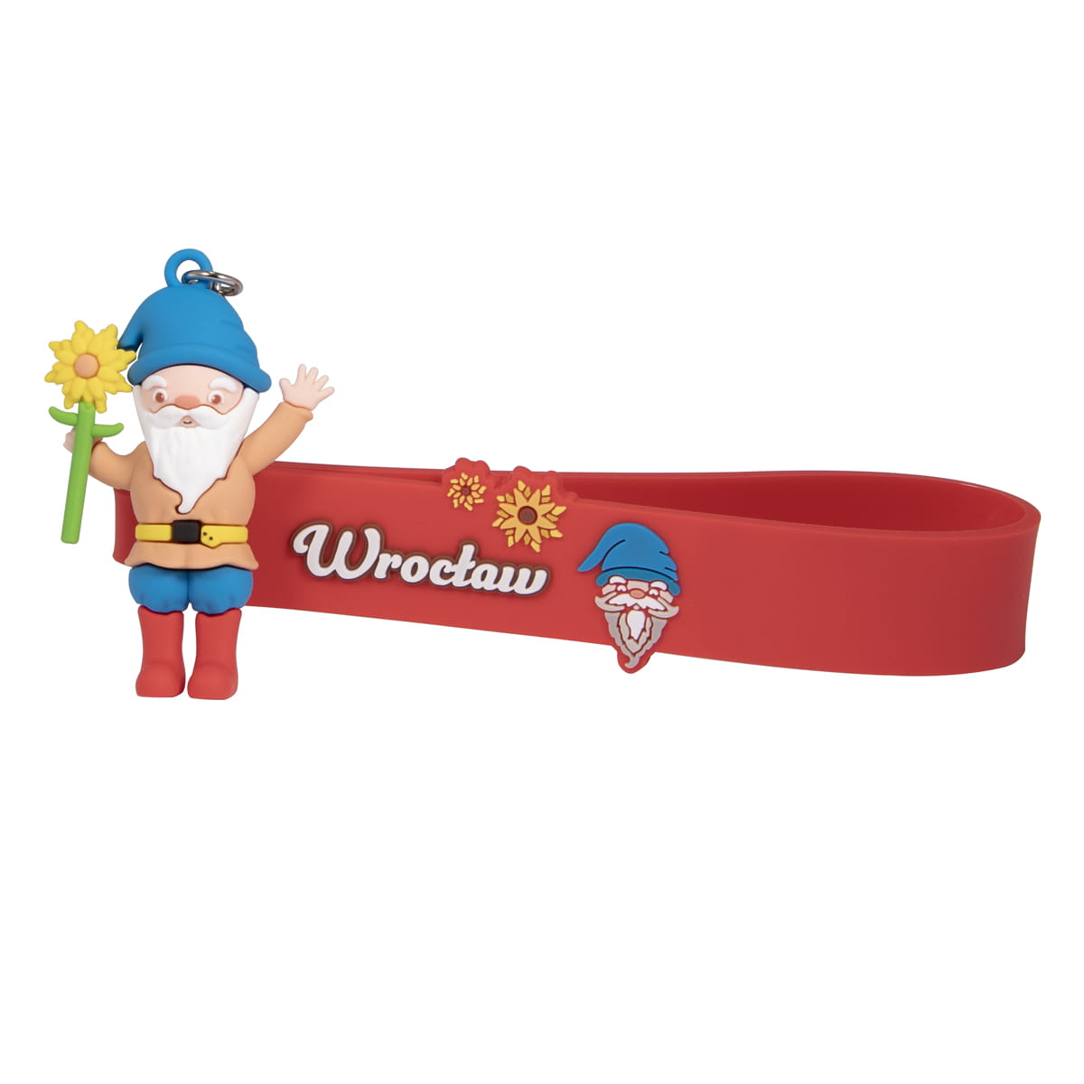 Elegancki, kolorowy, gumowy brelok z figurką krasnala trzymającego w dłoni kwiatek. Brelok posiada wysokiej jakości niklowane oczko i karabińczyk do zaczepienia kluczy. Opaska w kolorze fuksji z napisem "Wrocław", o długości 12cm, posiada również wypukły wizerunek postaci prezentowanej przez mierzącą 5cm wysokości figurkę.