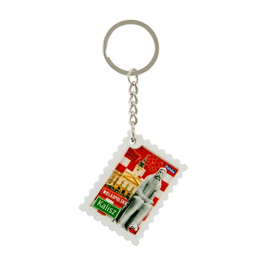 Kolorowy breloczek w kształcie znaczka pocztowego. Forma tego breloka była wpierw projektowana w stylu 3d i finalnie precyzyjnie wyfrezowana. Efekt jest taki że elementy, charakterystyczne dla miasta znajdujące się na breloku są wypukłe.