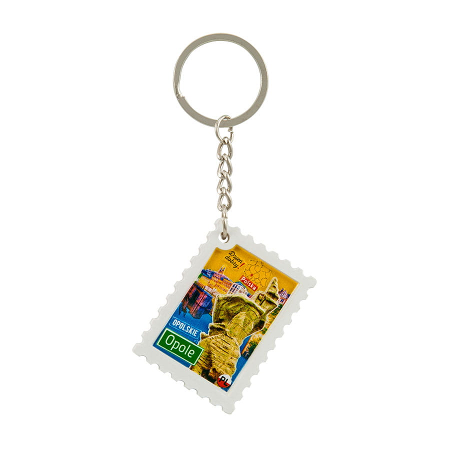 Kolorowy breloczek w kształcie znaczka pocztowego. Forma tego breloka była wpierw projektowana w stylu 3d i finalnie precyzyjnie wyfrezowana. Efekt jest taki że elementy, charakterystyczne dla miasta znajdujące się na breloku są wypukłe.
