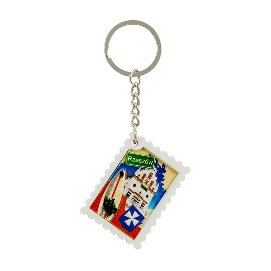 Kolorowy breloczek w kształcie znaczka pocztowego. Forma tego breloka była wpierw projektowana w stylu 3d i finalnie precyzyjnie wyfrezowana. Efekt jest taki że elementy, charakterystyczne dla miasta znajdujące się na breloku są wypukłe.