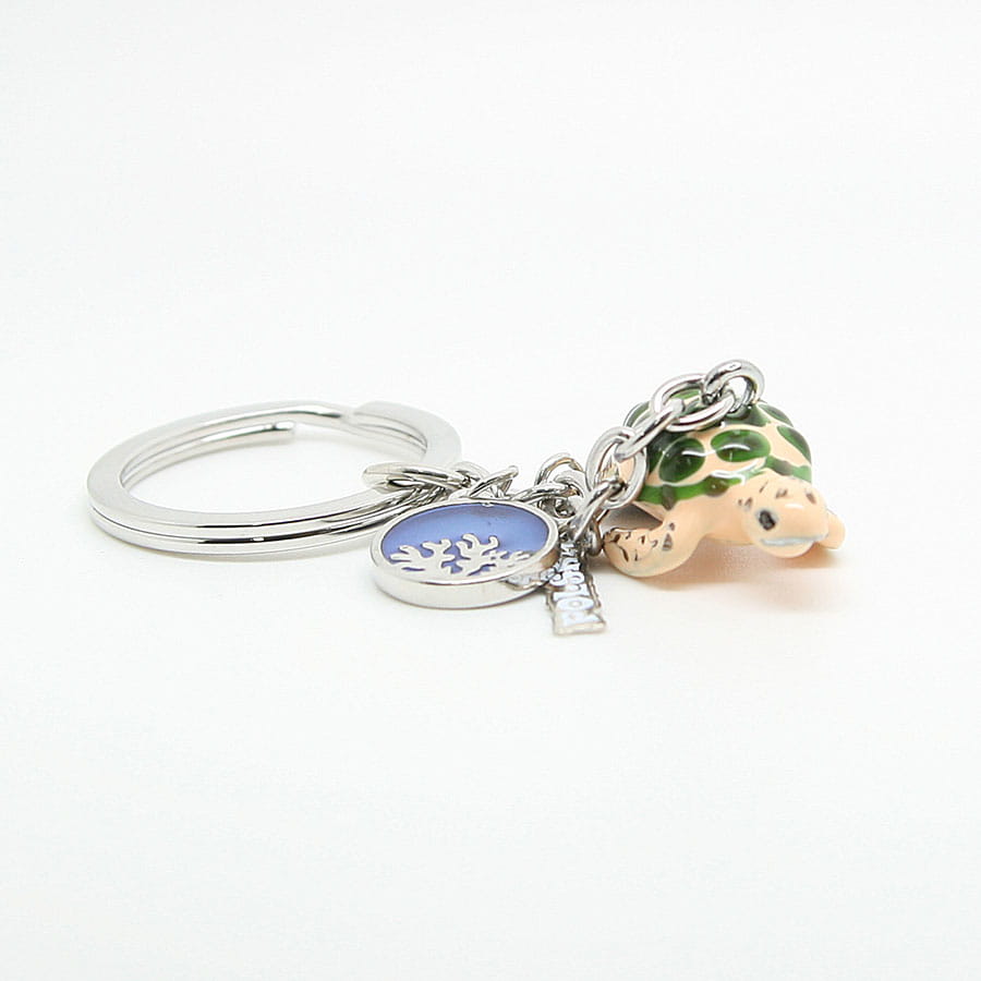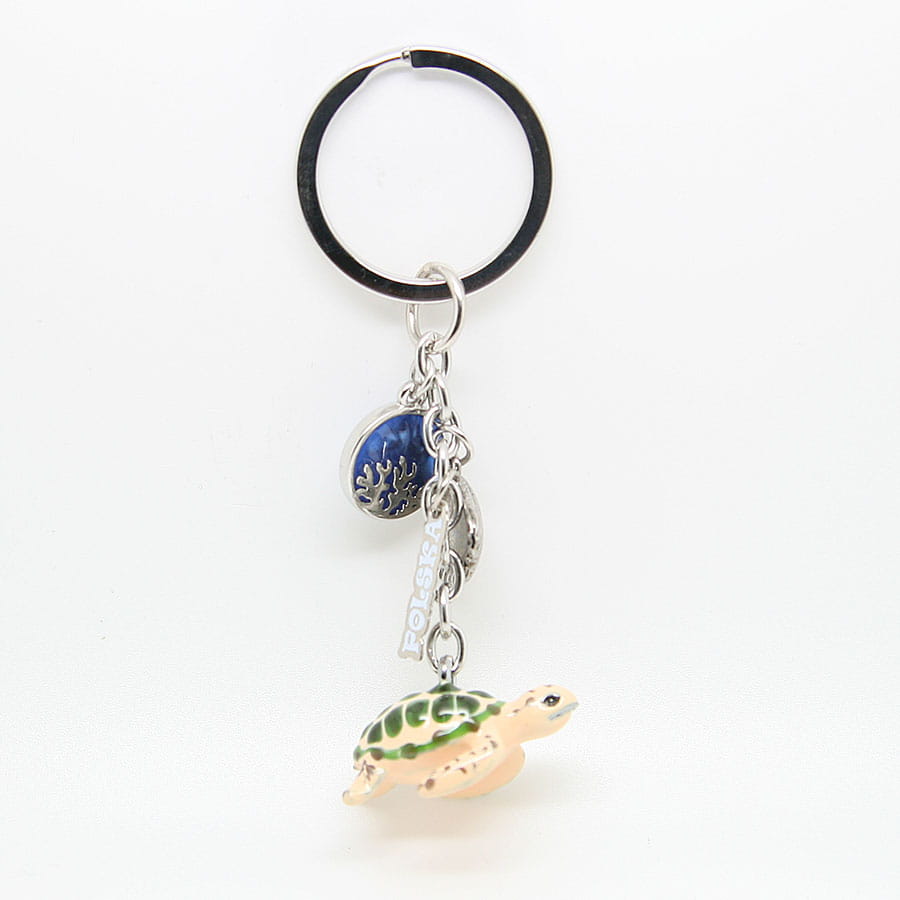 Metalowy, bardzo starannie wykonany brelok przedstawiający żółwia. Zrobiony w stylu popularnych zawieszek 'charms'. Przywieszkami są tabliczka z napisem "Polska", ozdobne kółko oraz muszelka. Zarówno brelok jak i doczepione do niego zawieszki wykonane są z wyjątkową dbałością o szczegóły. Mocowanie to wysokiej jakości oczko gwarantujące trwałe przyczepienie breloczka.