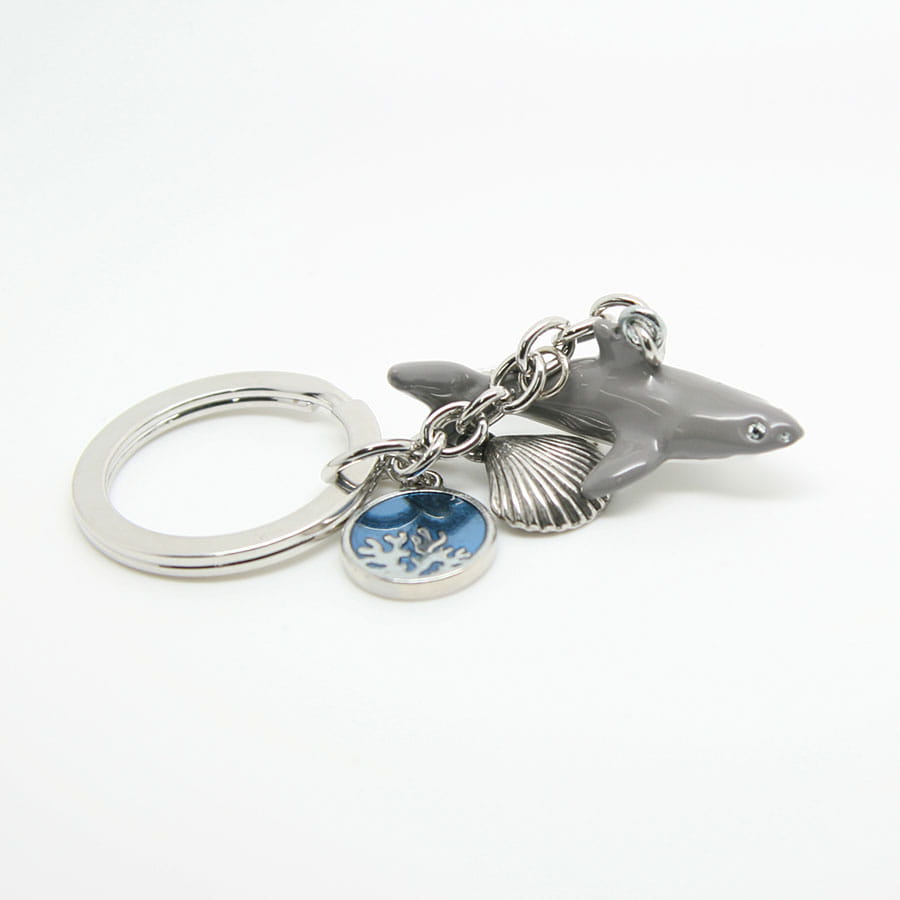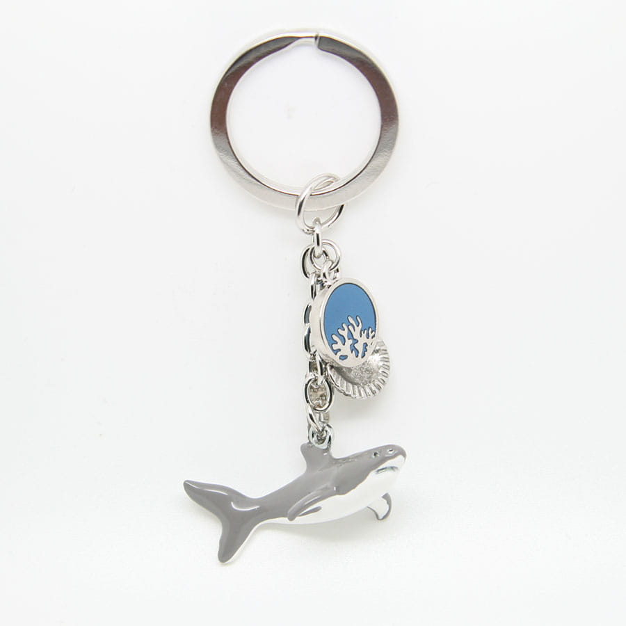 Metalowy, bardzo starannie wykonany brelok przedstawiający rekina. Zrobiony w stylu popularnych zawieszek 'charms'. Przywieszkami są tabliczka z napisem "Polska", ozdobne kółko oraz muszelka. Zarówno brelok jak i doczepione do niego zawieszki wykonane są z wyjątkową dbałością o szczegóły. Mocowanie to wysokiej jakości oczko gwarantujące trwałe przyczepienie breloczka.