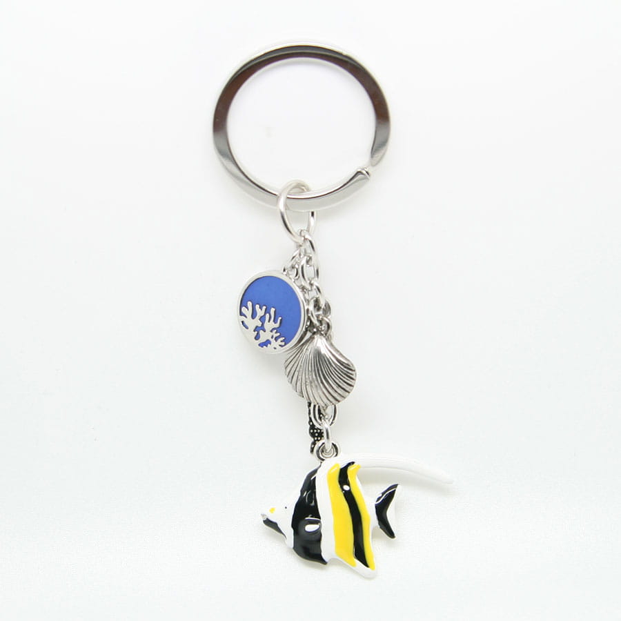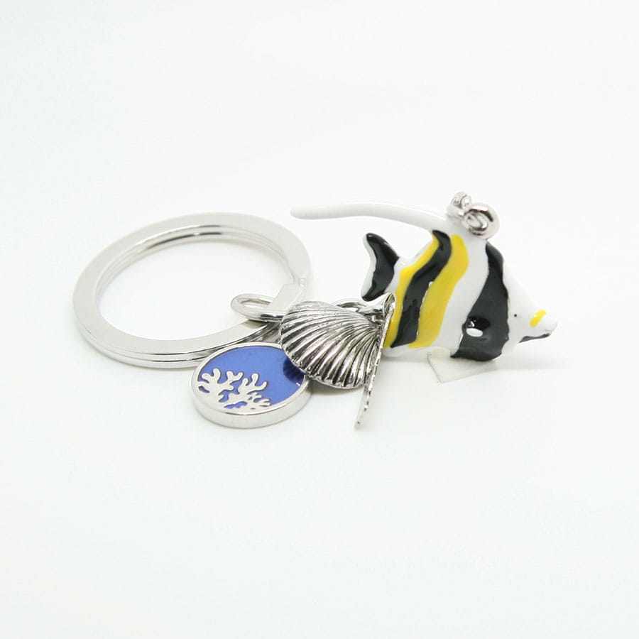 Metalowy, bardzo starannie wykonany brelok przedstawiający rybę skalar. Zrobiony w stylu popularnych zawieszek 'charms'. Przywieszkami są tabliczka z napisem "Polska", ozdobne kółko oraz muszelka. Zarówno brelok jak i doczepione do niego zawieszki wykonane są z wyjątkową dbałością o szczegóły. Mocowanie to wysokiej jakości oczko gwarantujące trwałe przyczepienie breloczka.