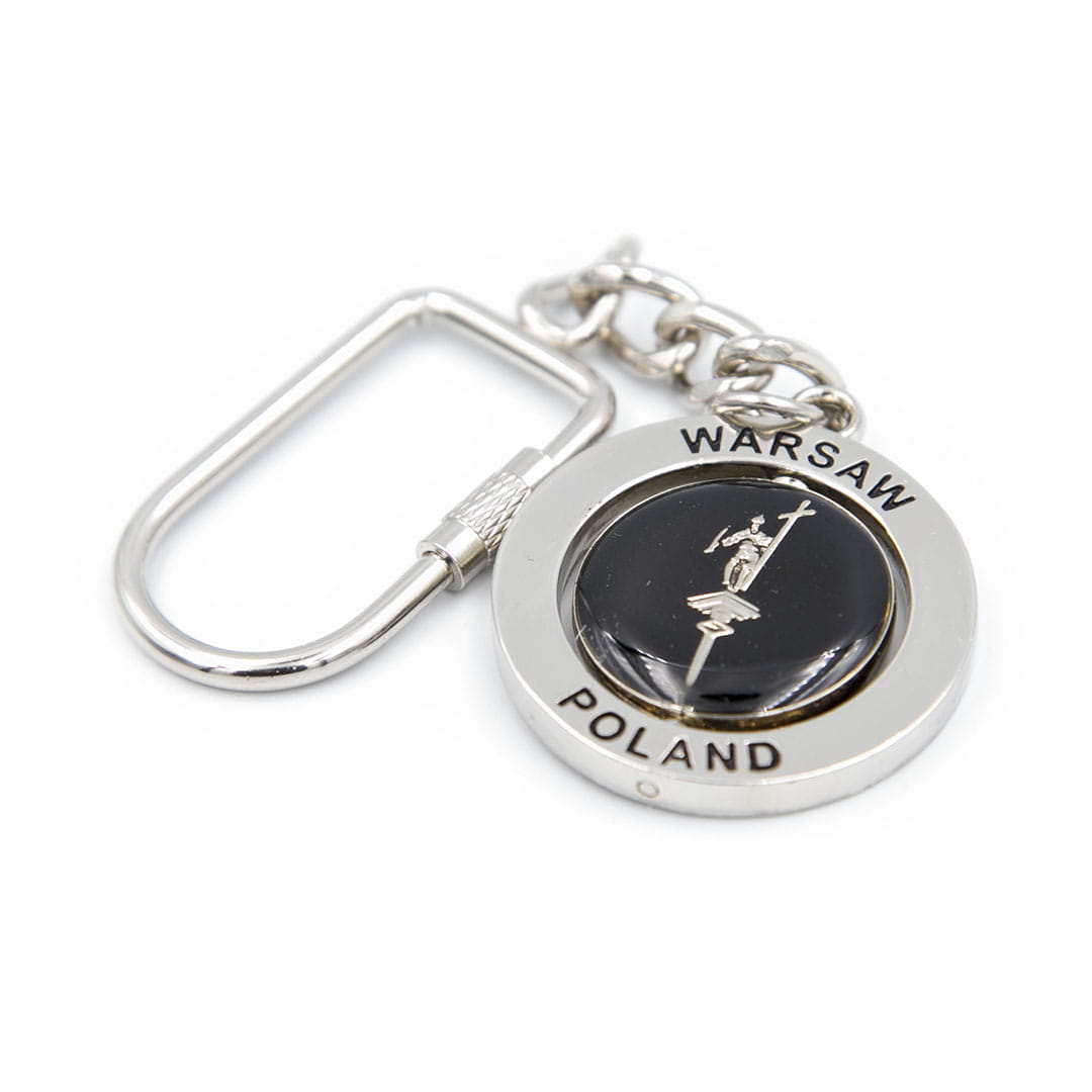 Metalowy, okrągły brelok z obrotowym środkiem. Na awersie obręczy na górze znajduje się napis "Polska", a na dole "Warszawa". Na rewersie na górze "Warsaw", na dole "Poland". Kółko w środku z jednej strony posiada Kolumnę Zygmunta na czarnym tle, a z drugiej flagę Polski z godłem. Mocowanie breloka to wysokiej jakości zakręcane oczko gwarantujące trwałe przyczepienie breloczka.