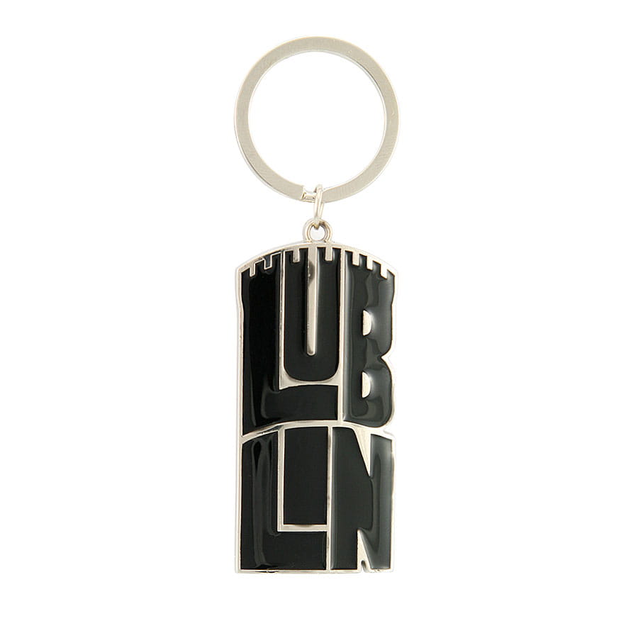 Metalowy czarny brelok przedstawiający napis Lublin. Napis jest ułożony w kształt bramy krakowskiej. Mocowanie breloka to wysokiej jakości oczko gwarantujące trwałe przyczepienie breloczka.