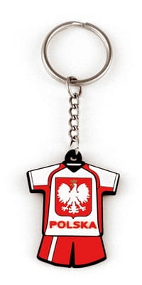 Gumowy kolorowy elastyczny brelok, w postaci stroju piłkarskiego w polskich barwach narodowych.