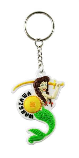 Gumowy, elastyczny brelok w kształcie syrenki warszawskiej z napisem "Warszawa". Mocowanie stanowi wysokiej jakości oczko gwarantujące trwałe przyczepienie breloczka.