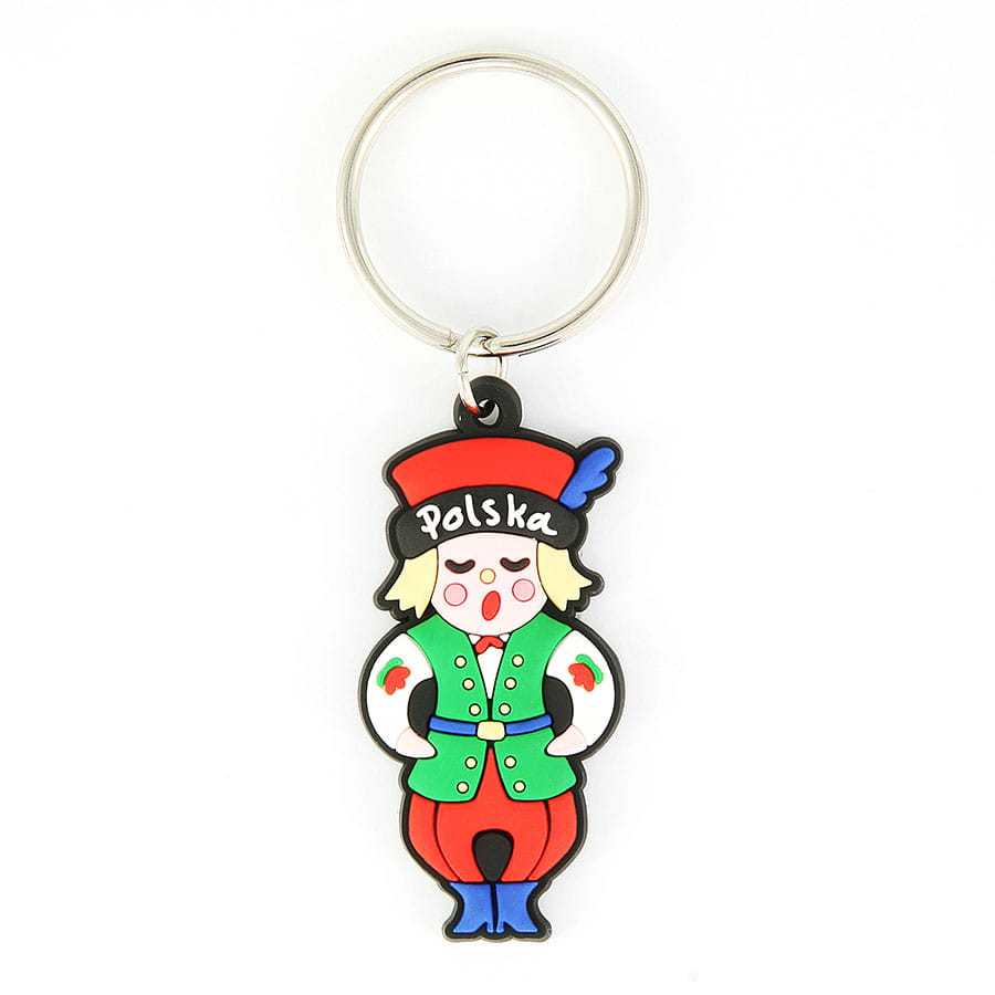 Gumowy, elastyczny brelok przedstawiający chłopca w tradycyjnym ludowym stroju. Na czapce widoczny napis "Polska". Mocowanie stanowi wysokiej jakości oczko gwarantujące trwałe przyczepienie breloczka.