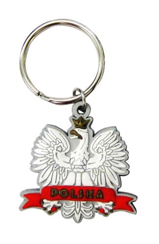 Gumowy kolorowy elastyczny brelok, w postaci Orła ze wstęgą z napisem Polska.