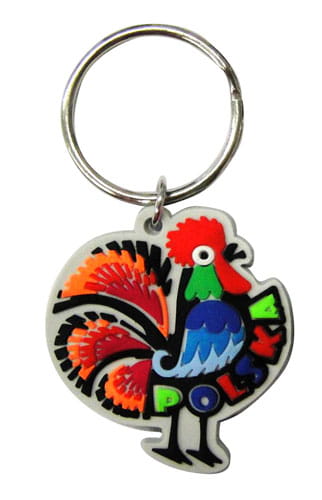 Gumowy, elastyczny brelok w kształcie kolorowego "łowickiego" koguta z napisem "Polska". Mocowanie stanowi wysokiej jakości oczko gwarantujące trwałe przyczepienie breloczka.