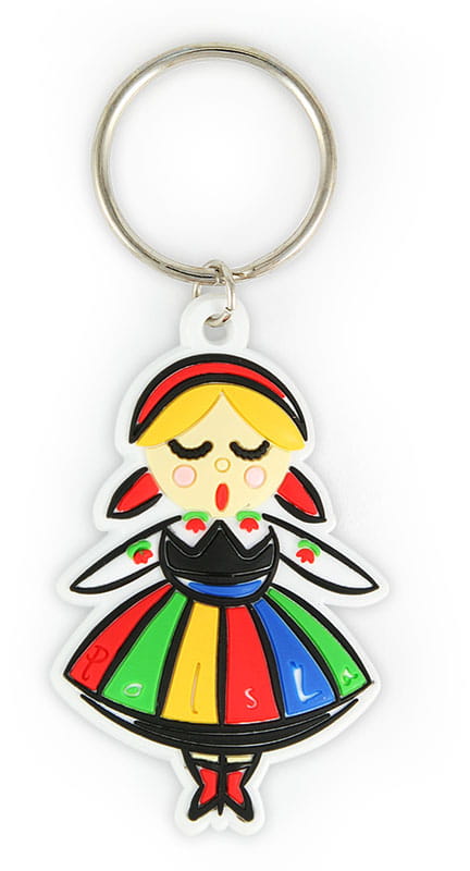 Gumowy, elastyczny brelok przedstawiający dziewczynkę w tradycyjnym ludowym stroju. Na jej spódnicy widnieje napis "Polska". Mocowanie stanowi wysokiej jakości oczko gwarantujące trwałe przyczepienie breloczka.