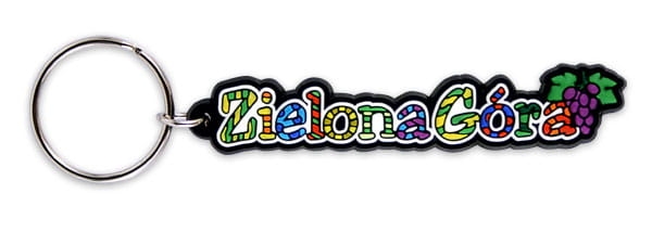 Gumowy, wielokolorowy, elastyczny brelok w kształcie napisu "Zielona Góra" z symboliczną kiścią winogron. Mocowanie stanowi wysokiej jakości oczko gwarantujące trwałe przyczepienie breloczka.