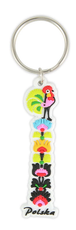 Kolorowy, gumowy, elastyczny brelok z folkowym kwiatowym motywem. Na górze paska znajduje się kogucik, a na dole napis "Polska". Mocowanie stanowi wysokiej jakości oczko gwarantujące trwałe przyczepienie breloczka.