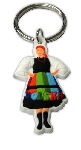 Gumowy, elastyczny brelok przedstawiający postać kobiety w stroju ludowym. Dodatkowo na jej spódnicy widnieje kolorowy napis "Polska". Mocowanie to wysokiej jakości oczko gwarantujące trwałe przyczepienie breloczka.