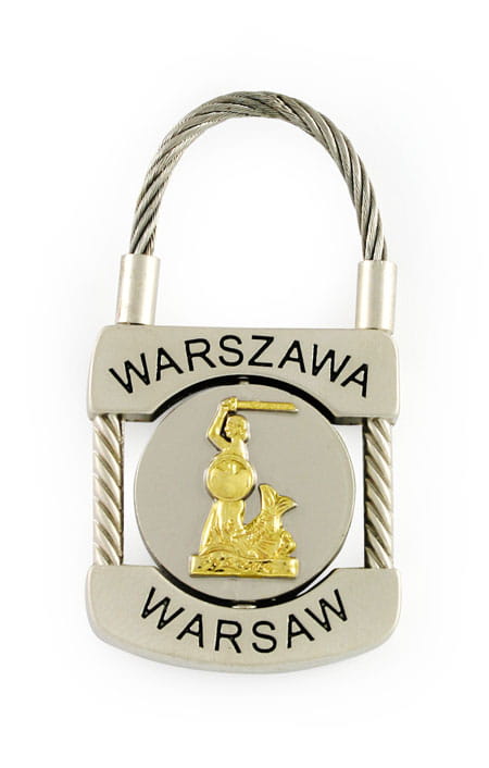 Metalowy brelok w kształcie kłódki. Wykonany przy użyciu stalowej linki. Na awersie breloczka znajdują się napisy "Warszawa", "Warsaw", a na rewersie "Poland" i "Polska". Środek produktu stanowi obrotowy element w kształcie koła na którym na awersie zamocowana jest odlewana Warszawska Syrenka w kolorze złotym, a na rewersie orzełek.