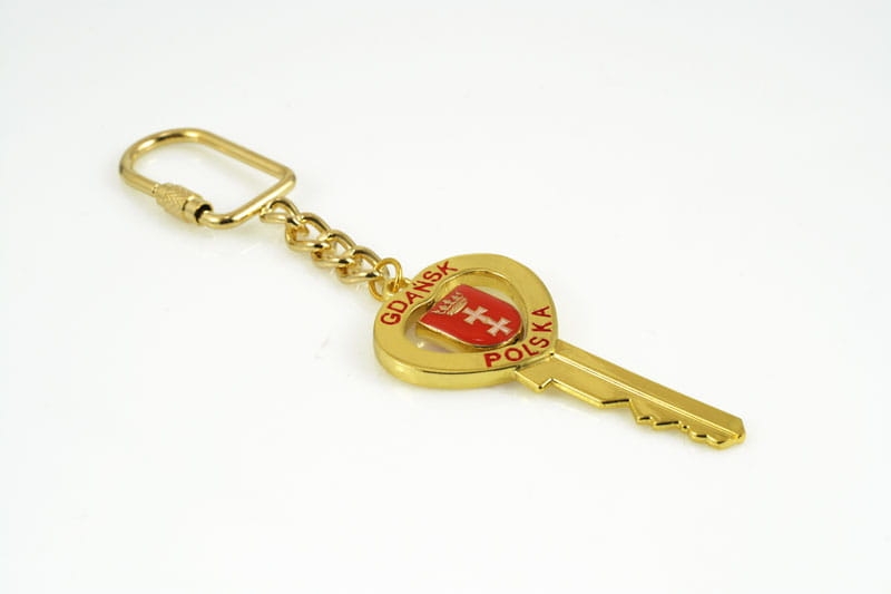 Metalowy brelok w kształcie klucza z obrotowym herbem Gdańska i napisami "Gdańsk", "Polska". Brelok jest w kolorze złotym, a napisy czerwone. Mocowanie stanowi wysokiej jakości zakręcane oczko gwarantujące trwałe przyczepienie breloczka.