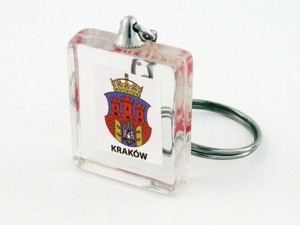 Akrylowy brelok z zatopionym herbem Krakowa i napisem "Kraków". Mocowanie stanowi wysokiej jakości oczko gwarantujące trwałe przyczepienie breloczka.