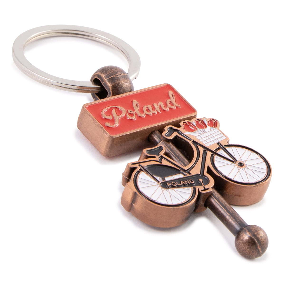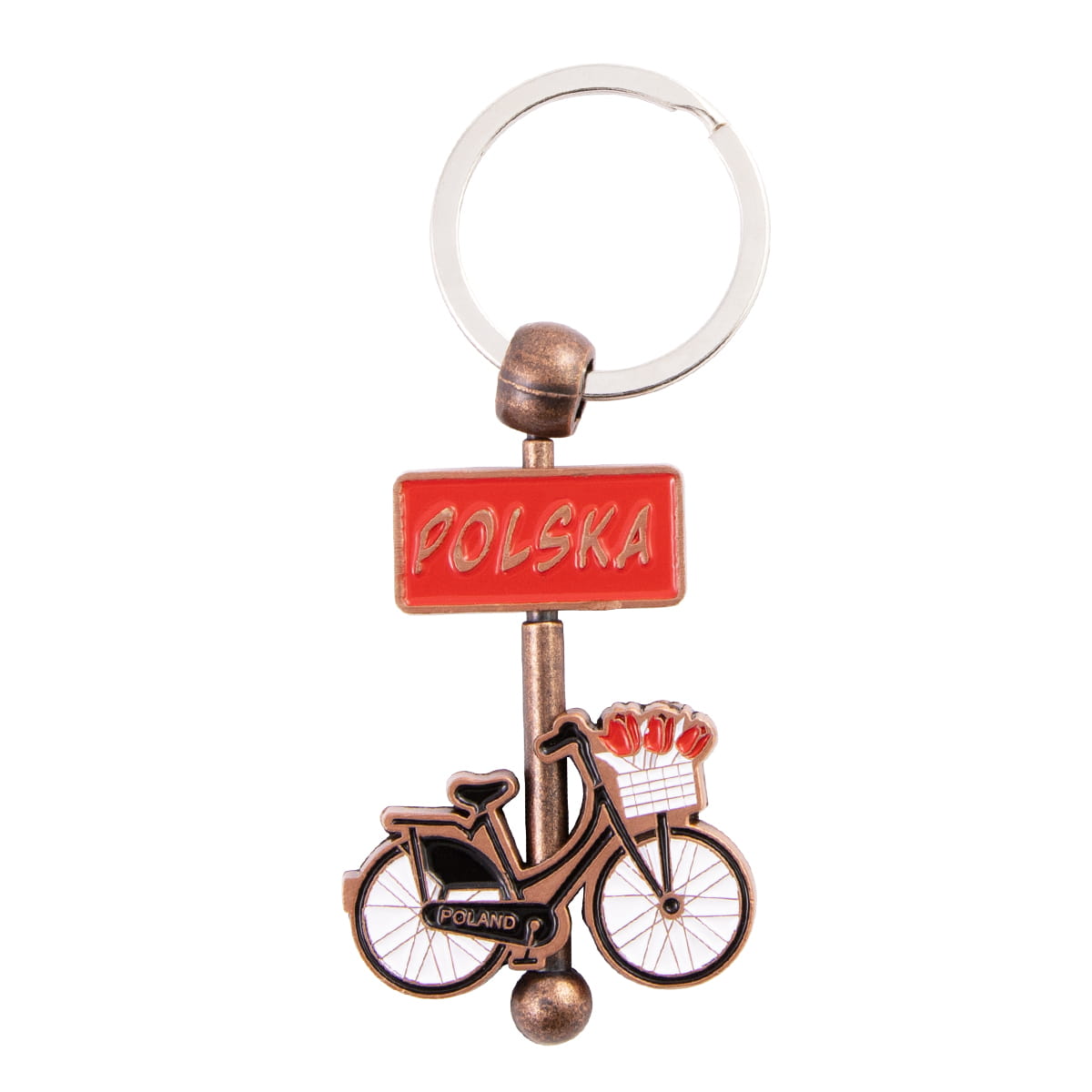 Metalowy breloczek z ruchomymi elementami, przedstawiający rower z koszem na kwiaty oparty o słupek z czerwoną tabliczką, na której znajdują się dwa napisy: od frontu Polska, a na rewersie Poland. Rower kręci się dookoła słupka, a także w górę i w dół. Na osłonie łańcucha rowerowego widnieje też niewielki, lecz wyraźny napis Poland.