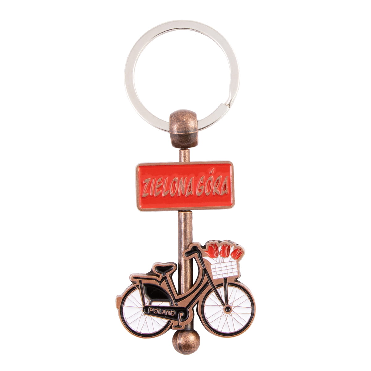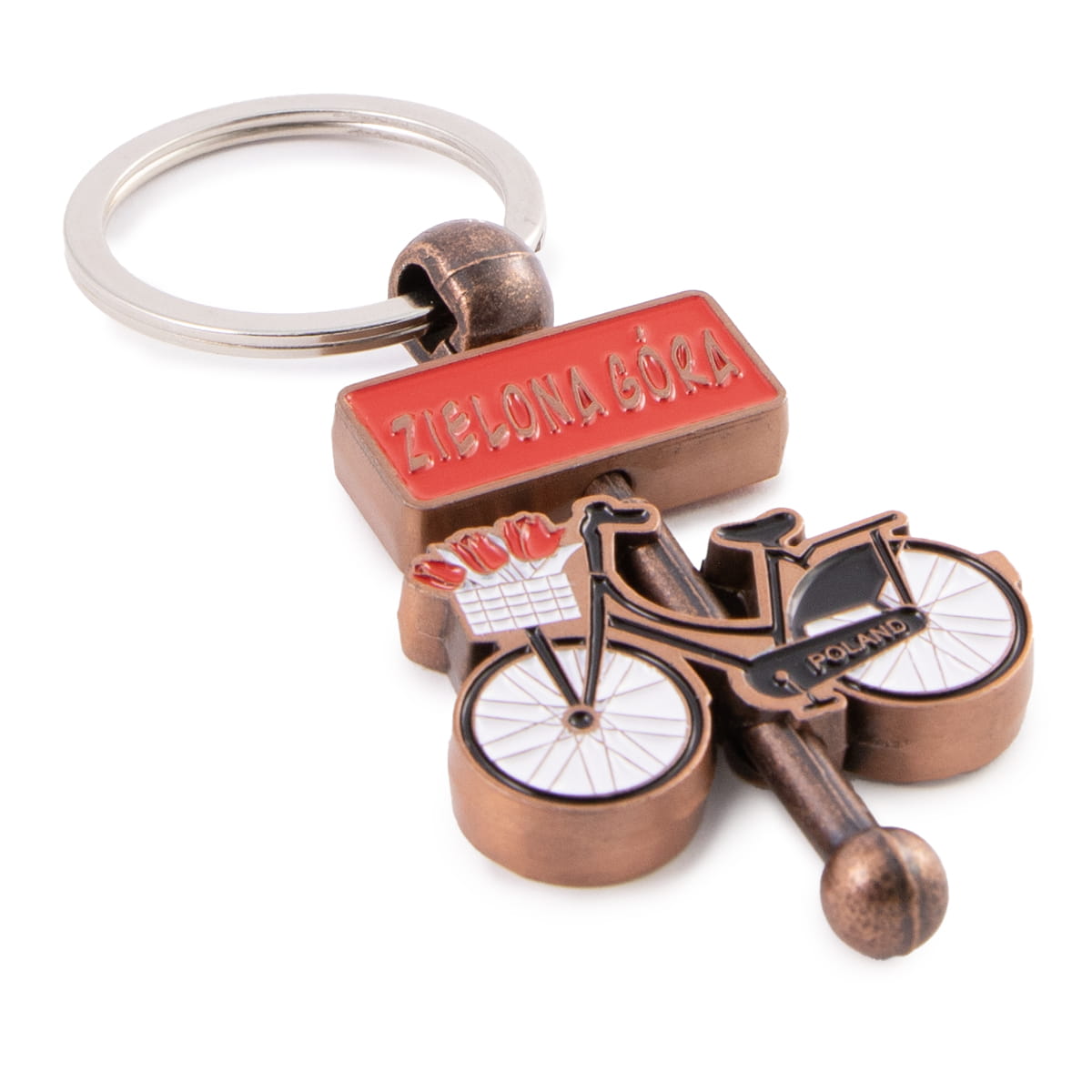 Metalowy breloczek z ruchomymi elementami, przedstawiający rower z koszem na kwiaty oparty o słupek z czerwoną tabliczką, na której znajdują się dwa napisy: od frontu Zielona Góra, a na rewersie Poland. Rower kręci się dookoła słupka, a także w górę i w dół. Na osłonie łańcucha rowerowego widnieje też niewielki, lecz wyraźny napis Poland.
