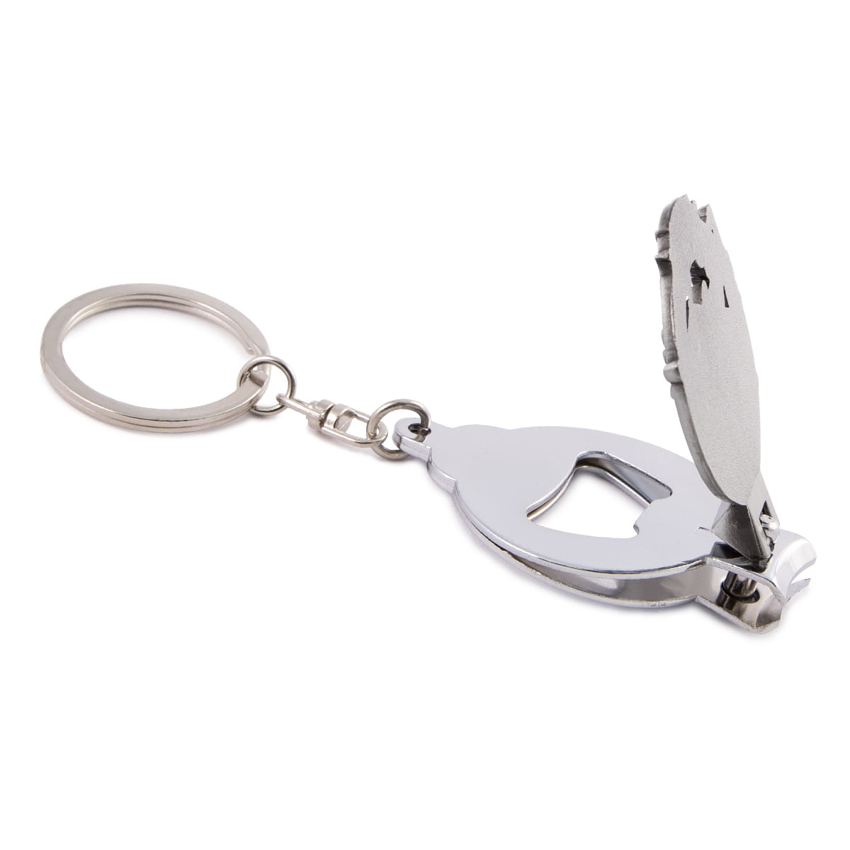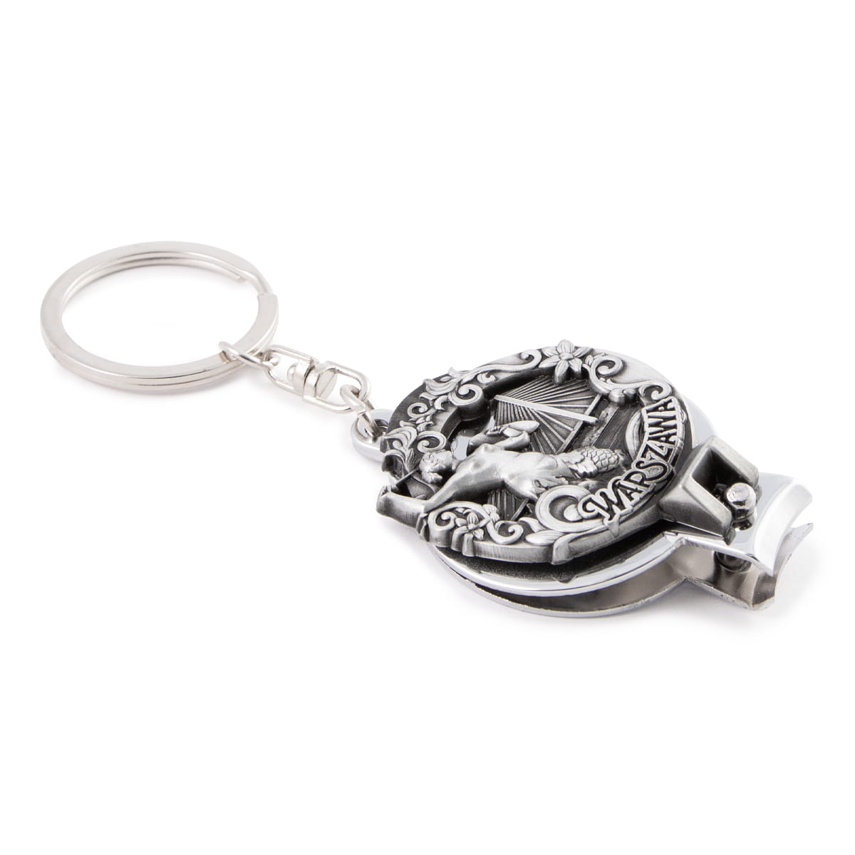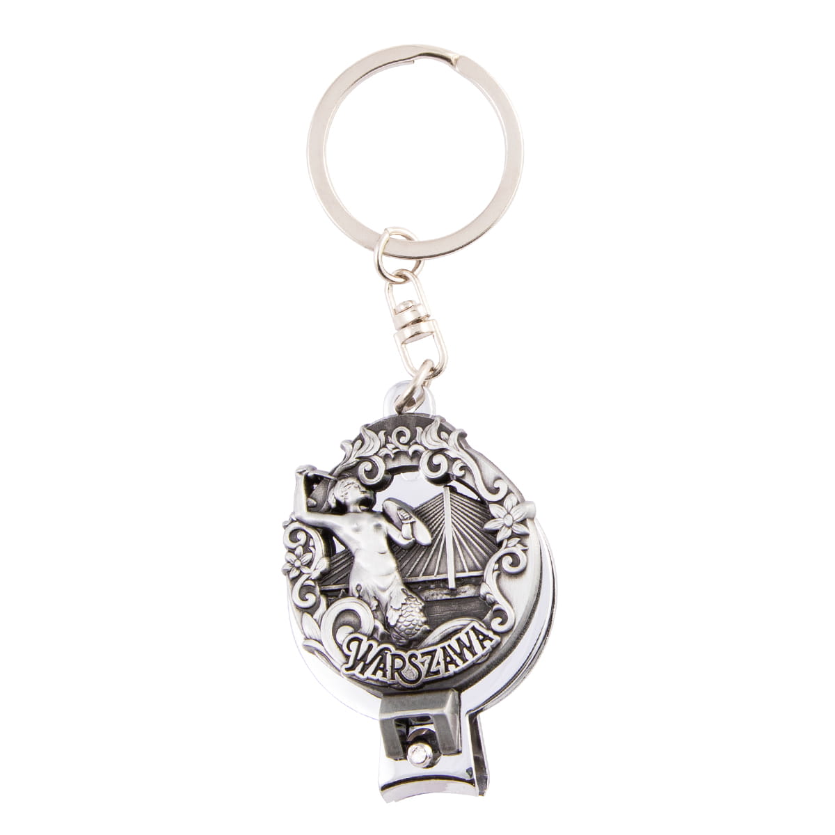 Metalowy, żłobiony, elegancki breloczek będący również obcinaczem do paznokci. Jego górna, zdobiona część przedstawia Syrenkę oraz most Świętokrzyski i wyraźny napis "Warszawa".