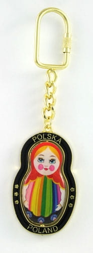 Metalowy brelok z obracającą się w środku wielobarwną Matrioszką. Pomimo małych rozmiarów, produkt cechuje wysoka dbałość o szczegóły oraz elegancja. Rama, w której zamocowany jest obrotowy element jest czarna ze zdobieniami i cienką ramką w kolorze złotym co nadaje wyjątkowych walorów estetycznych. Na ramie znajdują się też napisy "Polska" i "Poland". Mocowanie stanowi wysokiej jakości zakręcane oczko gwarantujące trwałe przyczepienie breloczka.