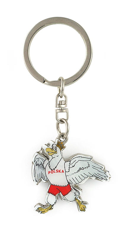 Metalowy, bardzo starannie wykonany brelok przedstawiający orła w koronie ubranego w białą koszulkę z napisem "Polska" i czerwone spodenki. Mocowanie to wysokiej jakości oczko gwarantujące trwałe przyczepienie breloczka.