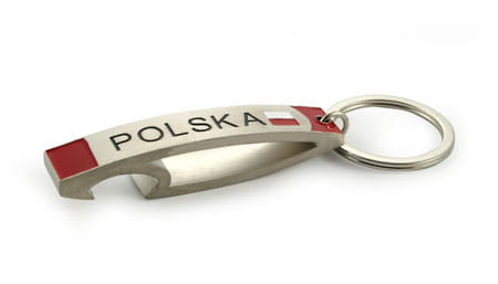 Metalowy, niklowany brelok wygięty w łuk - otwieracz do butelek. Posiada duży napis "Polska" oraz biało-czerwoną flagę. Mocowanie breloka to wysokiej jakości oczko gwarantujące trwałe przyczepienie breloczka.