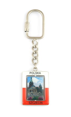 Metalowy, prostokątny brelok z obrotowym środkiem. Rama breloka jest biało-czerwona i znajdują się na niej napisy "Szczecin", "Polska". Mocowanie stanowi wysokiej jakości zakręcane oczko gwarantujące trwałe przyczepienie breloczka.