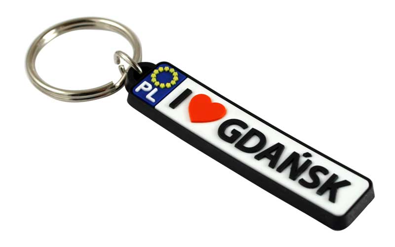 Gumowy, elastyczny brelok przypominający polską tablice rejestracyjną. Na białym tle zamiast numerów rejestracyjnych znajduje się napis "I ❤ Gdańsk". Wszystkie znaki są wytłaczane. Mocowanie stanowi wysokiej jakości oczko gwarantujące trwałe przyczepienie breloczka.