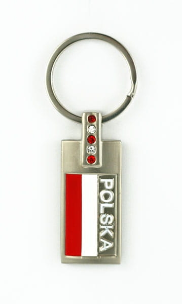 Metalowy, niklowany brelok z białymi i czerwonymi cyrkoniami. Na breloku znajduje się duży, biały napis "Polska", oraz duża biało-czerwona flaga. Mocowanie breloka to wysokiej jakości oczko gwarantujące trwałe przyczepienie breloczka.