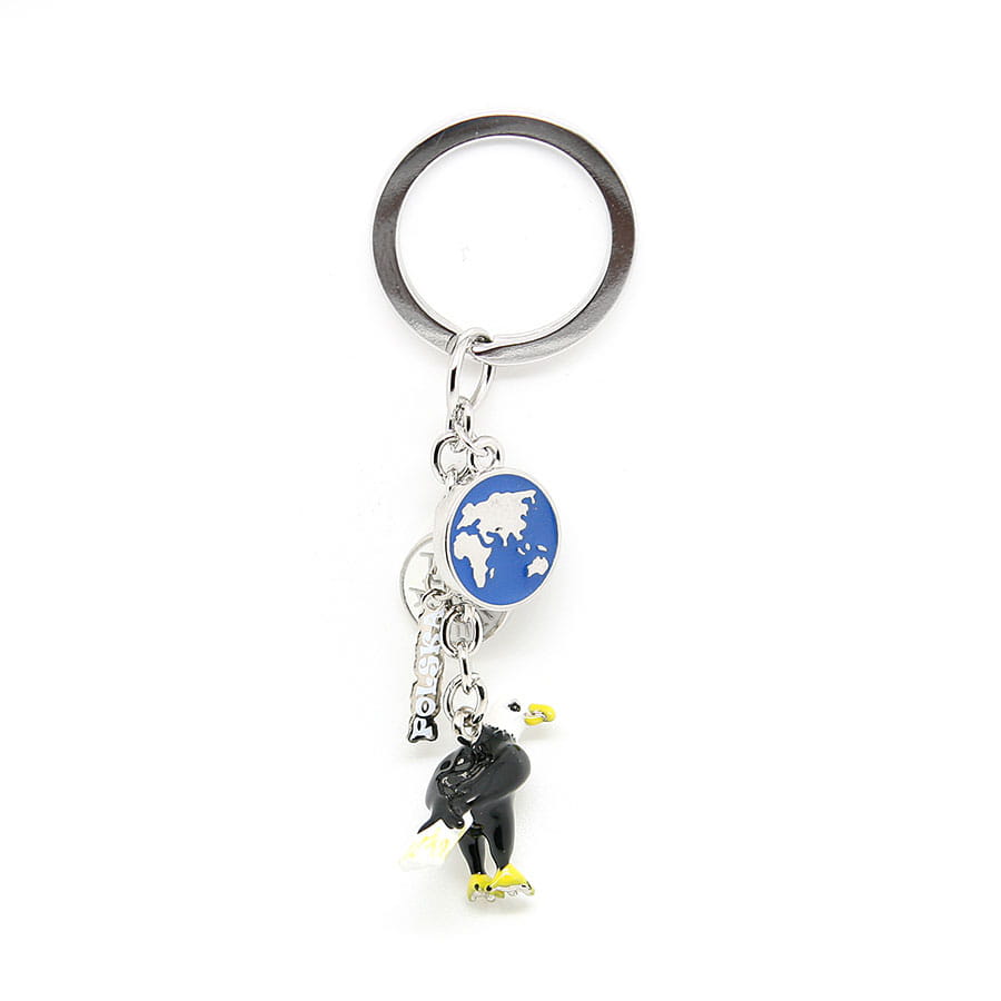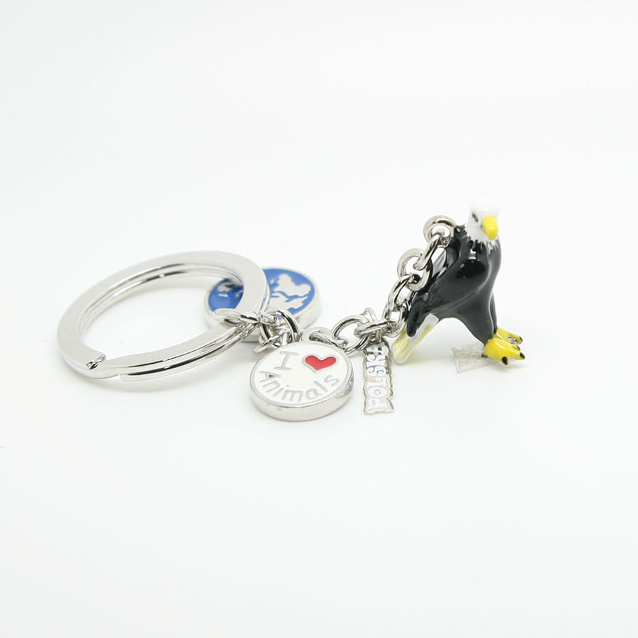 Metalowy, bardzo starannie wykonany brelok przedstawiający orła. Zrobiony w stylu popularnych zawieszek 'charms'. Przywieszkami są tabliczka z napisem "Polska", ozdobne kółko oraz muszelka. Zarówno brelok jak i doczepione do niego zawieszki wykonane są z wyjątkową dbałością o szczegóły. Mocowanie to wysokiej jakości oczko gwarantujące trwałe przyczepienie breloczka.