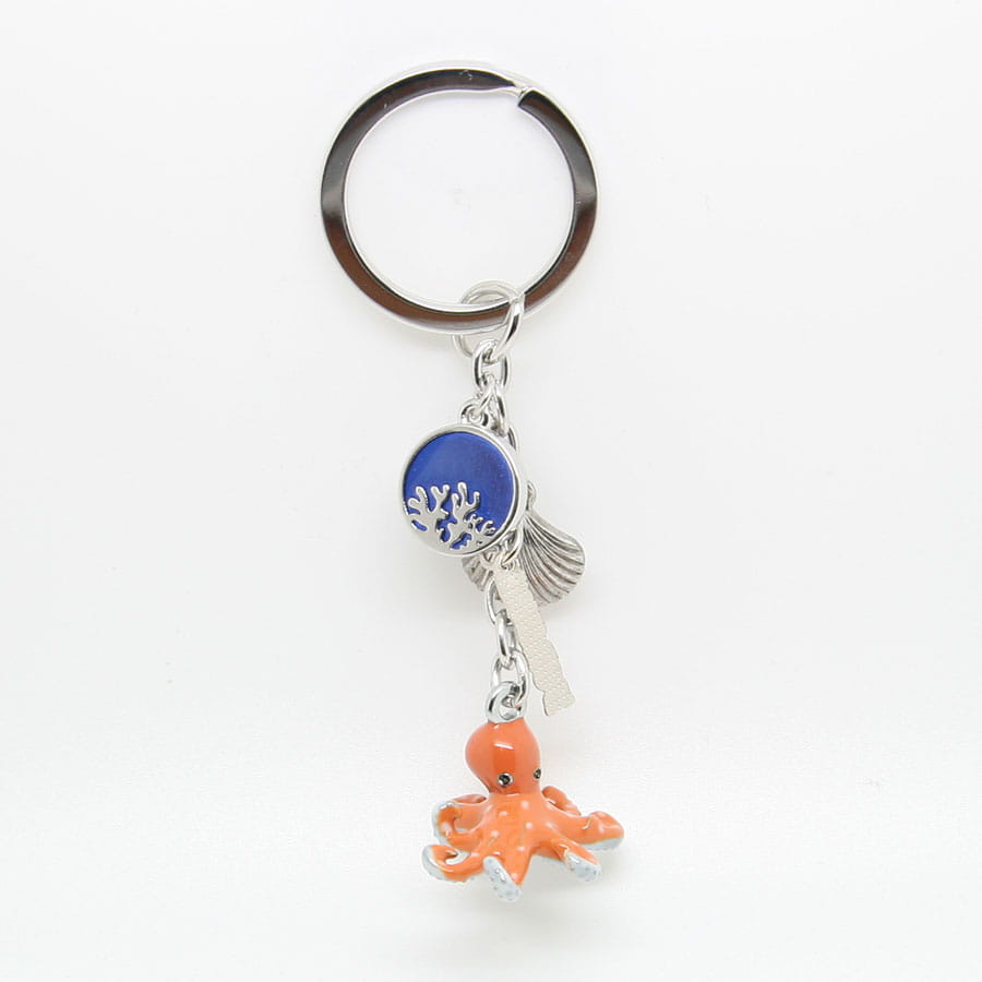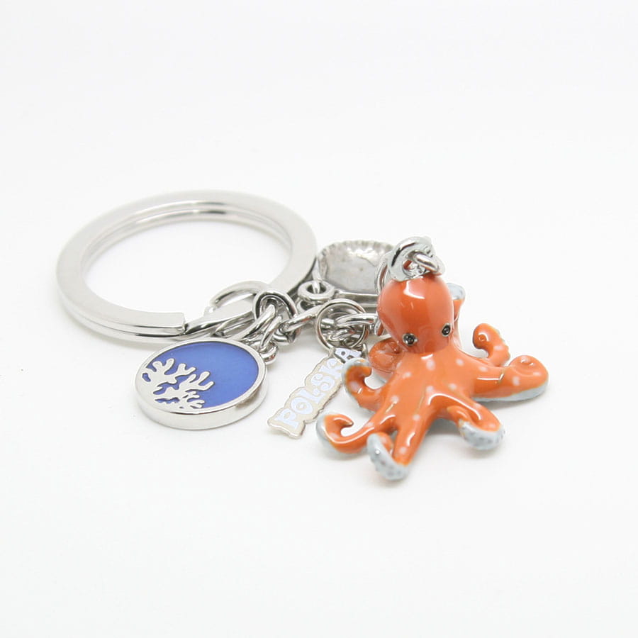 Metalowy, bardzo starannie wykonany brelok przedstawiający ośmiornice. Zrobiony w stylu popularnych zawieszek 'charms'. Przywieszkami są tabliczka z napisem "Polska", ozdobne kółko oraz muszelka. Zarówno brelok jak i doczepione do niego zawieszki wykonane są z wyjątkową dbałością o szczegóły. Mocowanie to wysokiej jakości oczko gwarantujące trwałe przyczepienie breloczka.