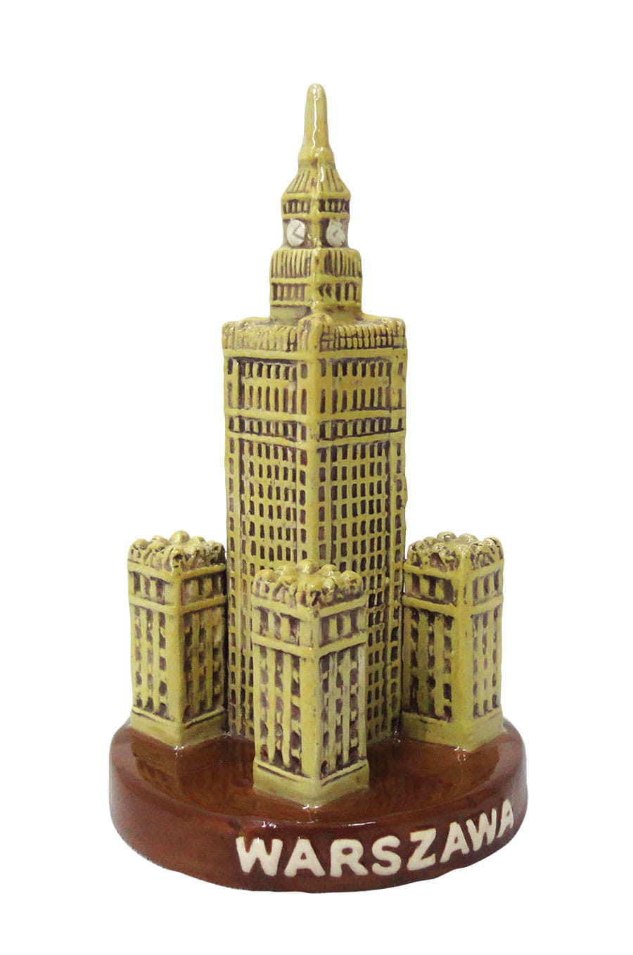 Ceramiczna statuetka przedstawiająca warszawski Pałac Kultury i Nauki. Na podstawie widnieje napis Warszawa.