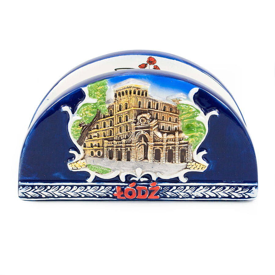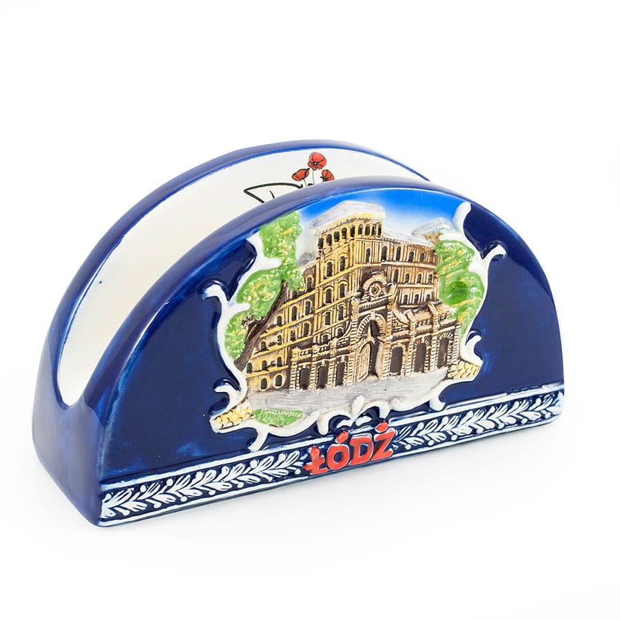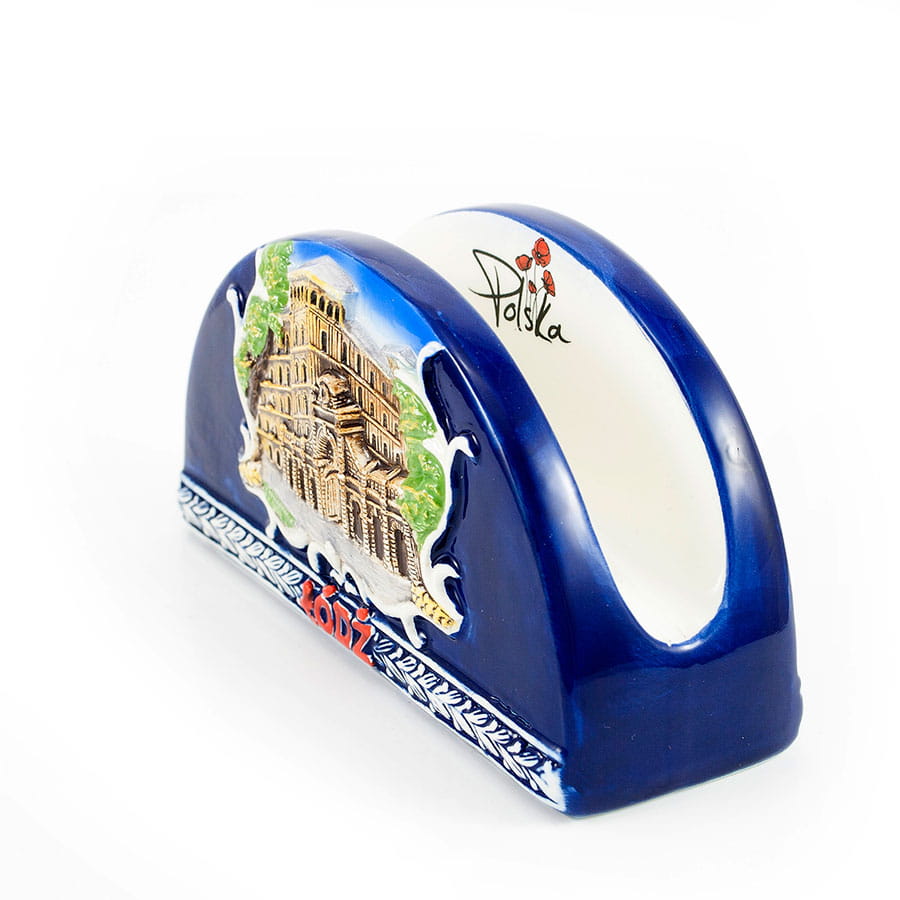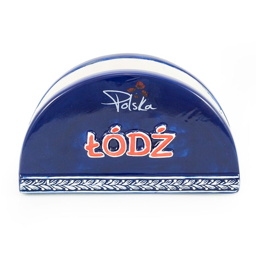 Ręcznie malowany, niebieski, ceramiczny serwetnik zdobiony z jednej strony wizerunkiem Łódzkiej Manufaktury, a z drugiej dużym, biało-czerwonym napisem "Łódź". Na serwetniku po obu stronach znajduje się również biały ozdobny pasek. Dodatkowo od wewnętrznej strony znajduje się bardzo elegancki napis "Polska" zdobiony subtelnie rysunkami maków.
