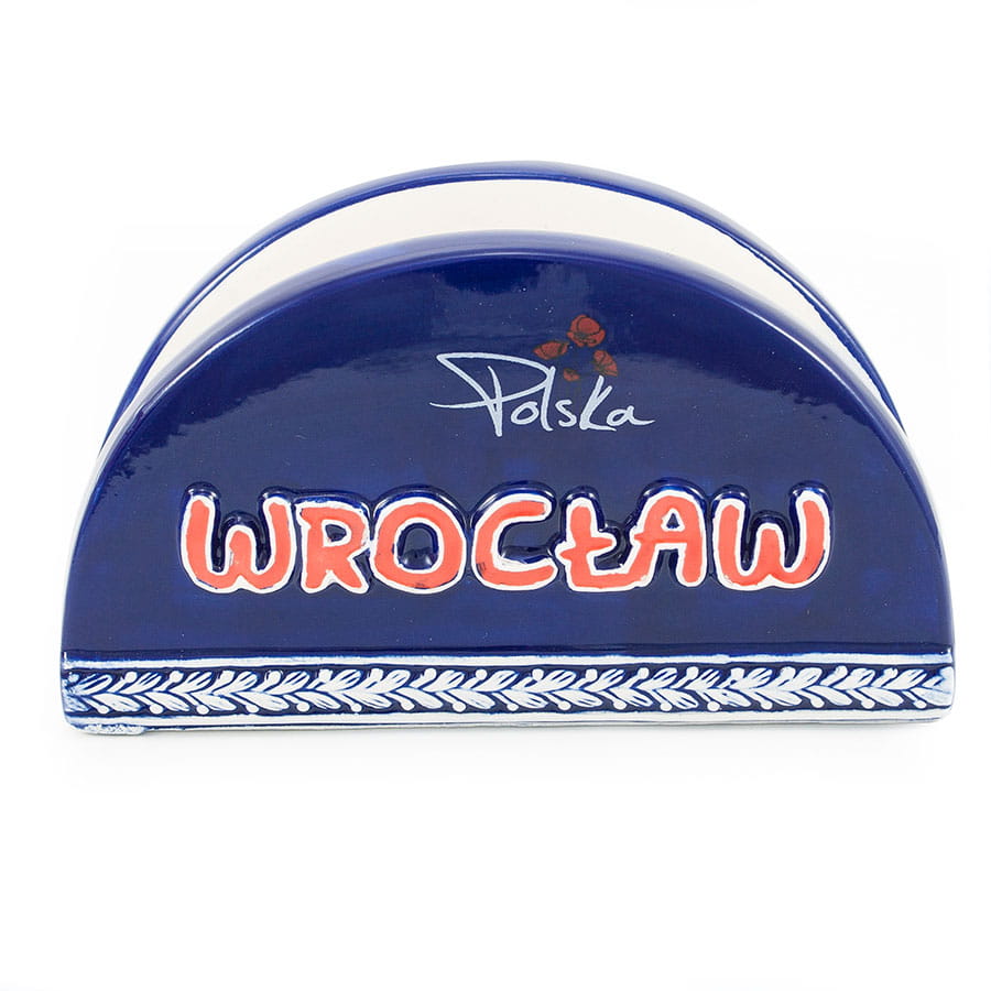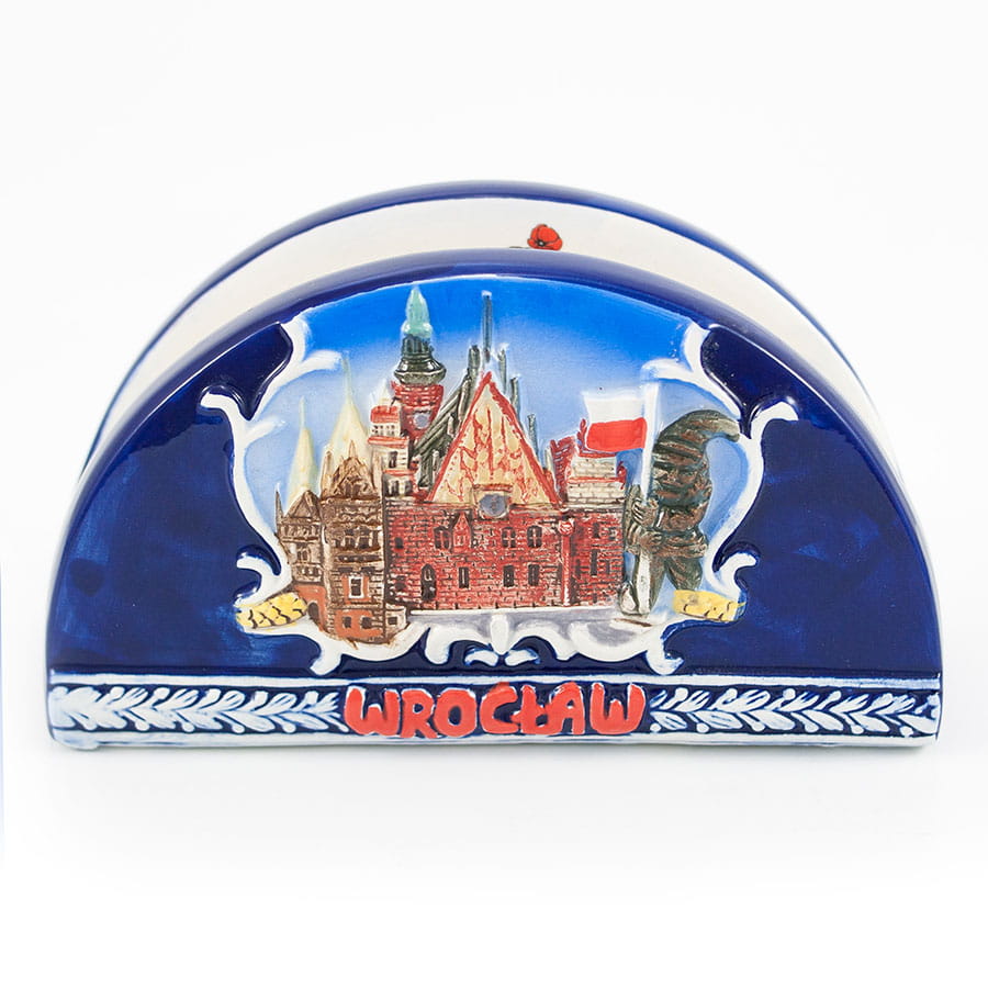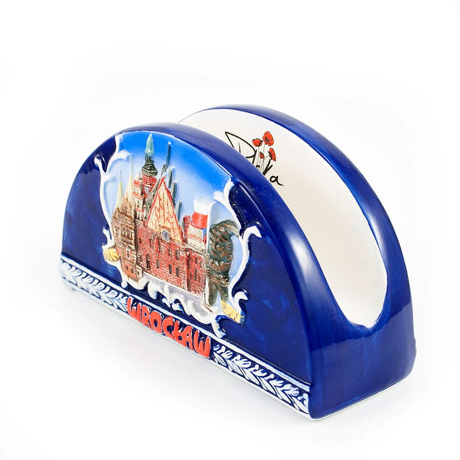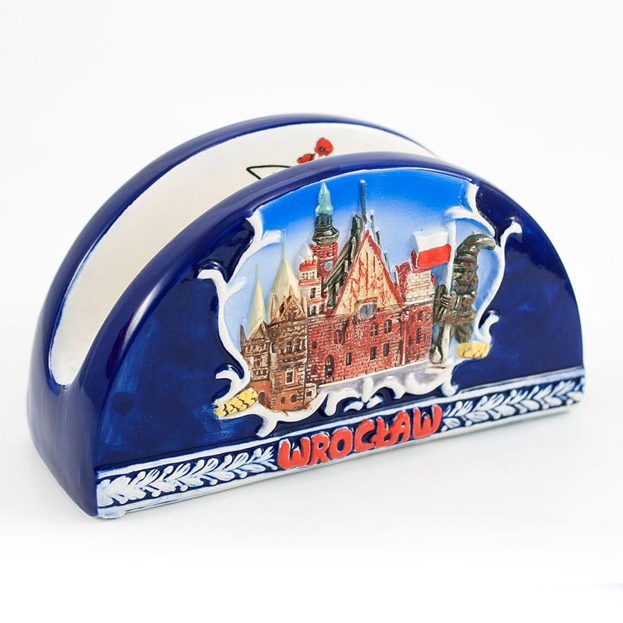 Ręcznie malowany, niebieski, ceramiczny serwetnik zdobiony z jednej strony wizerunkiem wrocławskiego Ratusza i symbolicznym krasnalem trzymającym biało-czerwoną flagę, a z drugiej dużym, biało-czerwonym napisem "Wrocław". Na serwetniku, po obu stronach znajduje się również biały ozdobny pasek. Dodatkowo od wewnętrznej strony znajduje się bardzo elegancki napis "Polska" zdobiony subtelnie rysunkami maków.