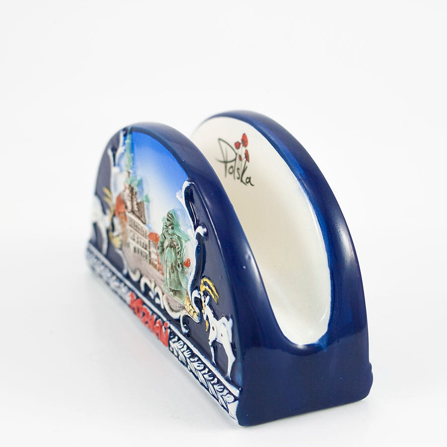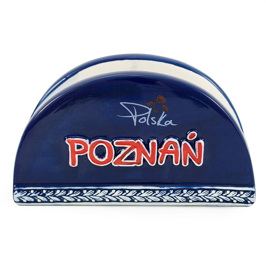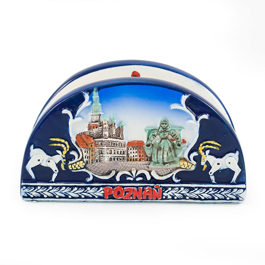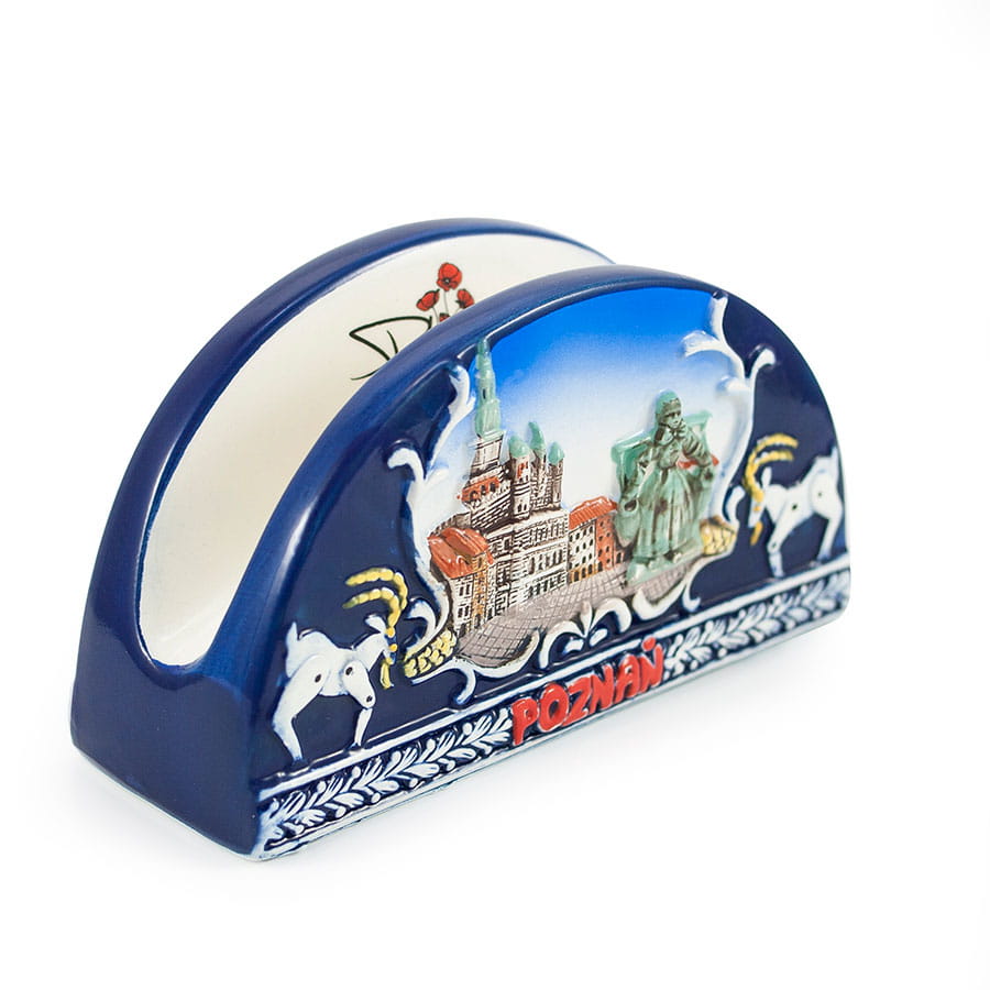 Ręcznie malowany, niebieski, ceramiczny serwetnik zdobiony z jednej strony wizerunkiem poznańskiego Ratusza, pomnika Bamberki oraz bodącymi się koziołkami, a z drugiej dużym, biało-czerwonym napisem "Poznań". Na serwetniku po obu stronach znajduje się również biały ozdobny pasek. Dodatkowo od wewnętrznej strony znajduje się bardzo elegancki napis "Polska" zdobiony subtelnie rysunkami maków.