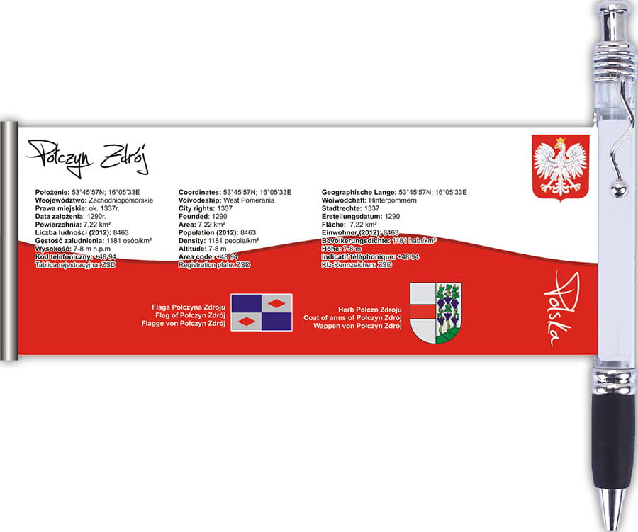 Wewnątrz długopisu znajduje się rozwijany baner z podpisanymi zdjęciami obiektów z Połczyna-Zdrój oraz danymi statystycznymi na temat tego miasta.