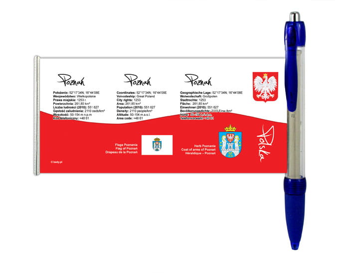 Wewnątrz długopisu znajduje się rozwijany baner. Na froncie banera zdjęcia obiektów z Poznania wraz z podpisami. Po drugiej stronie, dane statystyczne na temat miasta.