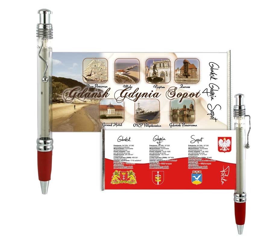 Długopis Trójmiasto. Wewnątrz długopisu znajduje się rozwijany baner. Na froncie banera zdjęcia obiektów z Trójmiasta wraz z podpisami. Po drugiej stronie, dane statystyczne na temat miasta.