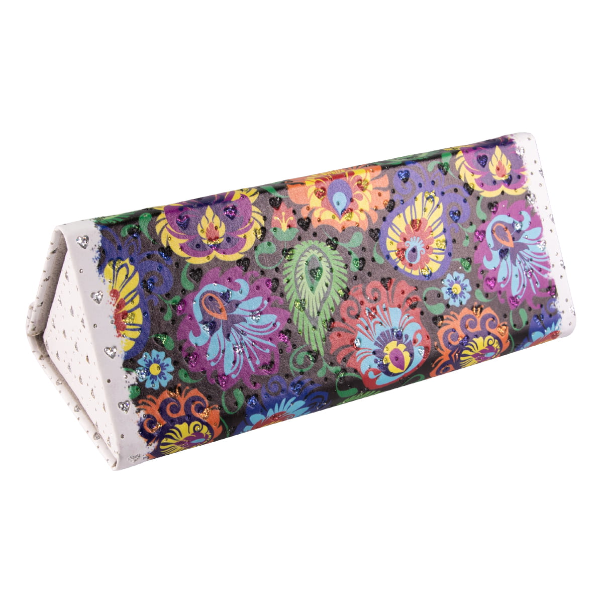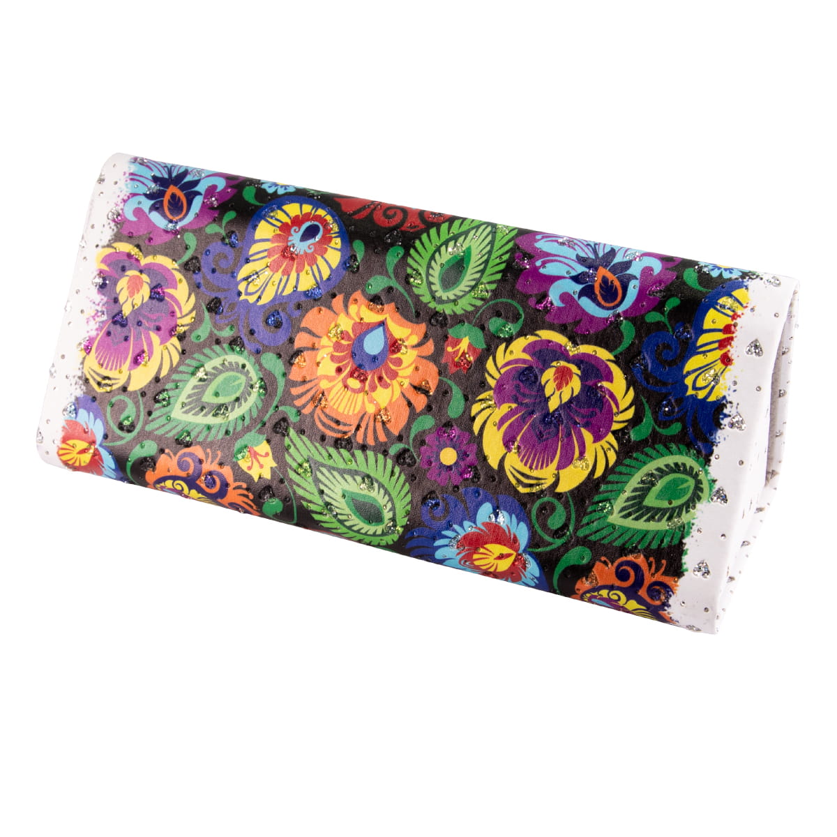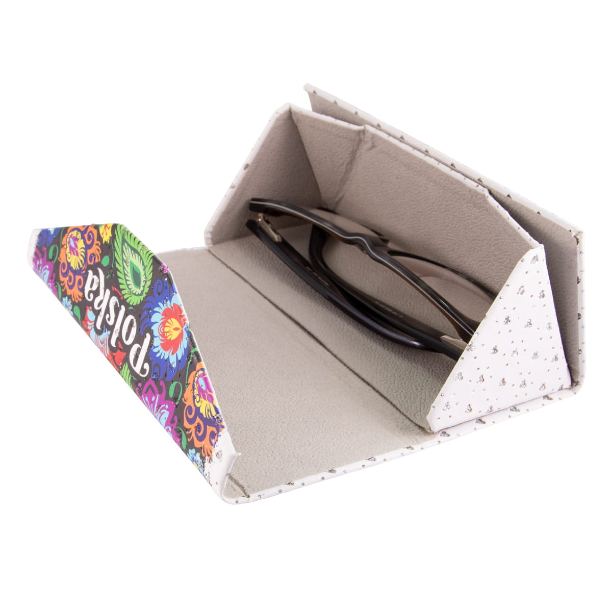 Elegancki, wysokiej jakości, składany futerał na okulary. Utrzymany jest w folkowym, kwiatowym klimacie, gdzie duże wyraźne kwiaty w żywych barwach umieszczone są na czarnym tle. Etui wykonane jest z fakturowanej ekoskóry zdobionej brokatowymi akcentami. Pudełko zamykane jest za pomocą eleganckiej klapki, opatrzonej magnesem, dzięki czemu nie otwiera się, zapobiegając uszkodzeniu okularów. Futerał można również złożyć, przez co zajmuje on bardzo mało miejsca. Jego rozmiar po złożeniu to 70 x 160 x 15 mm.