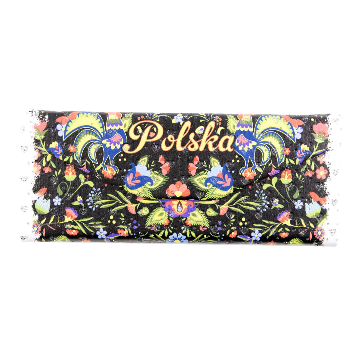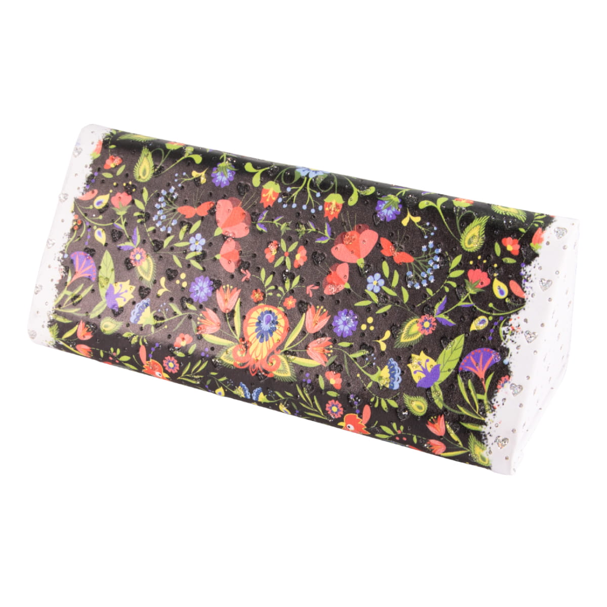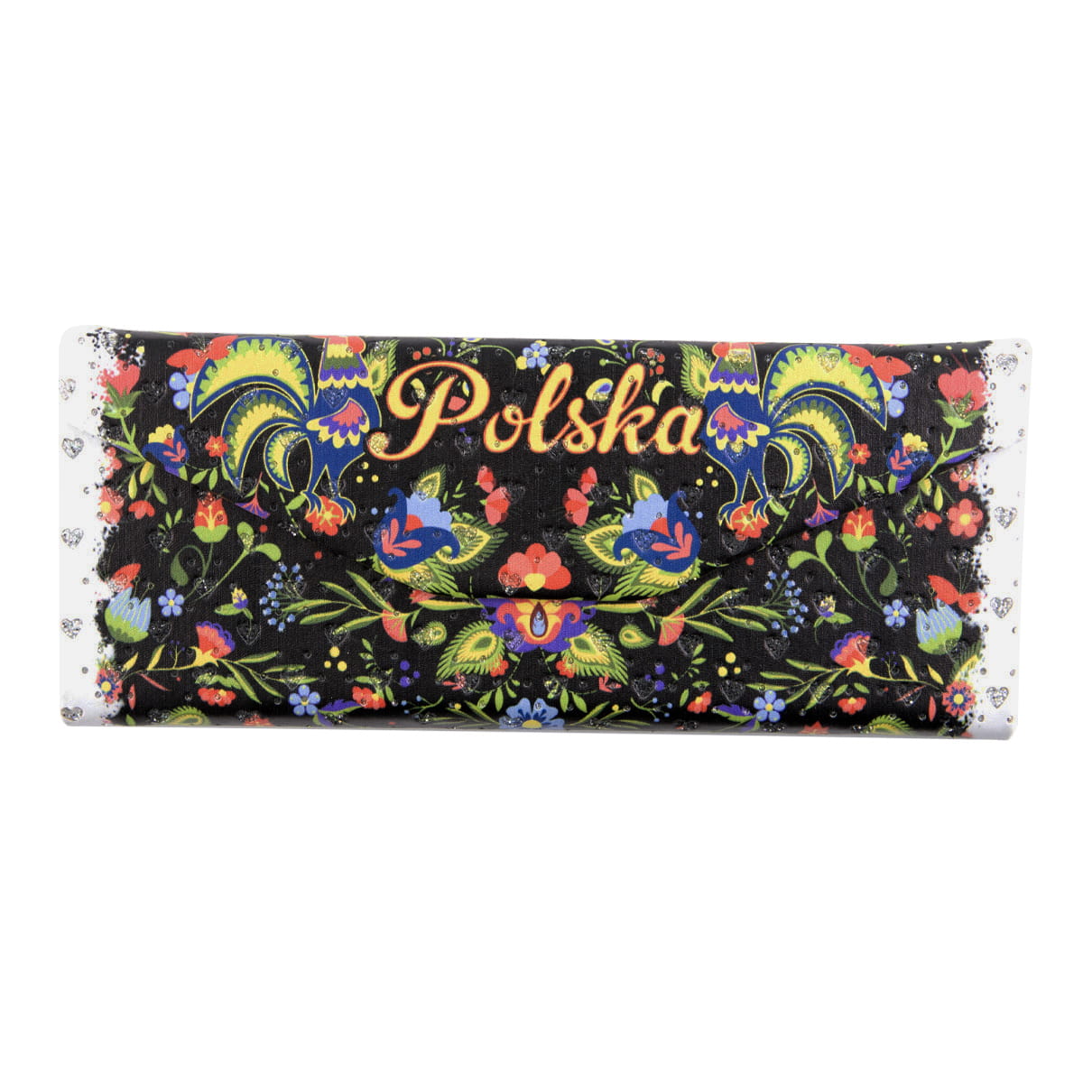 Elegancki, wysokiej jakości, składany futerał na okulary. Utrzymany jest w folkowym, kwiatowym klimacie na czarnym tle. Etui wykonane jest z fakturowanej ekoskóry zdobionej brokatowymi akcentami. Pudełko zamykane jest za pomocą eleganckiej klapki, opatrzonej magnesem, dzięki czemu nie otwiera się, zapobiegając uszkodzeniu okularów. Futerał można również złożyć, przez co zajmuje on bardzo mało miejsca. Jego rozmiar po złożeniu to 70 x 160 x 15 mm.