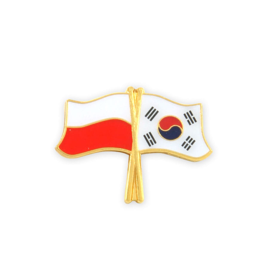 Metalowa przypinka z flagami Polski i Korei Południowej.