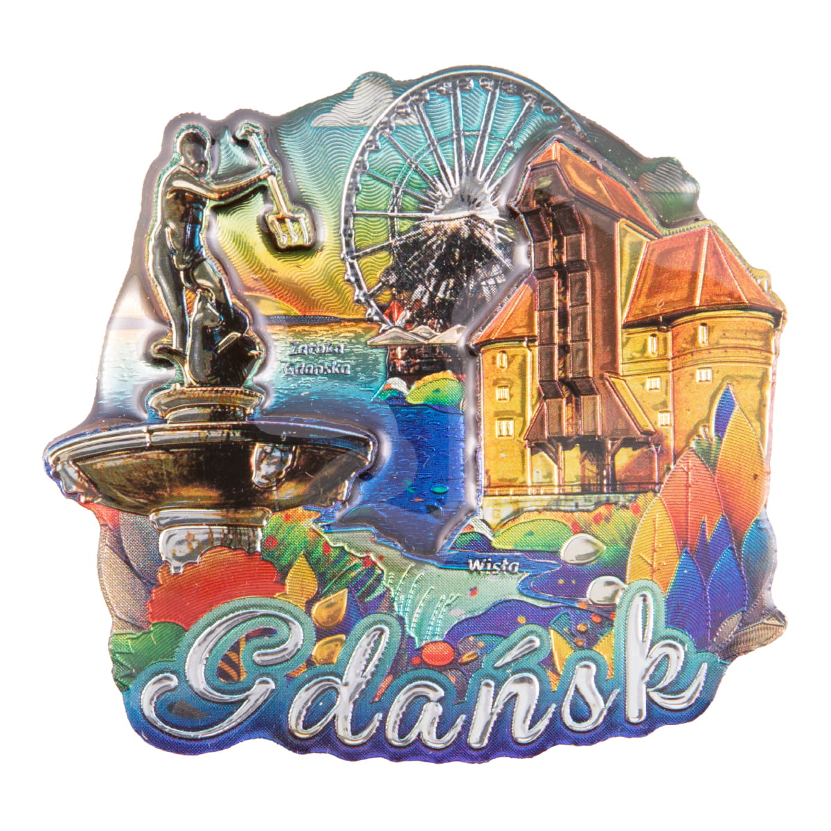 Wykonany z MDF dwuwarstwowy magnes metalizowany, przedstawiający panoramę Gdańska. Wśród prezentowanych na magnesie elementów zauważyć można między innymi fontanne Neptuna, diabelski młyn oraz Żurawia. Widoczny jest na nim też wyraźny napis "Gdańsk". Front magnesu zalany jest żywicą epoksydową zapewniającą trwałość kolorów i nadającą połysk. Na rewersie umieszczona jest duża, wysokiej klasy folia magnetyczna zapewniająca trwałe, bezpieczne umocowanie pamiątki na metalowej powierzchni.