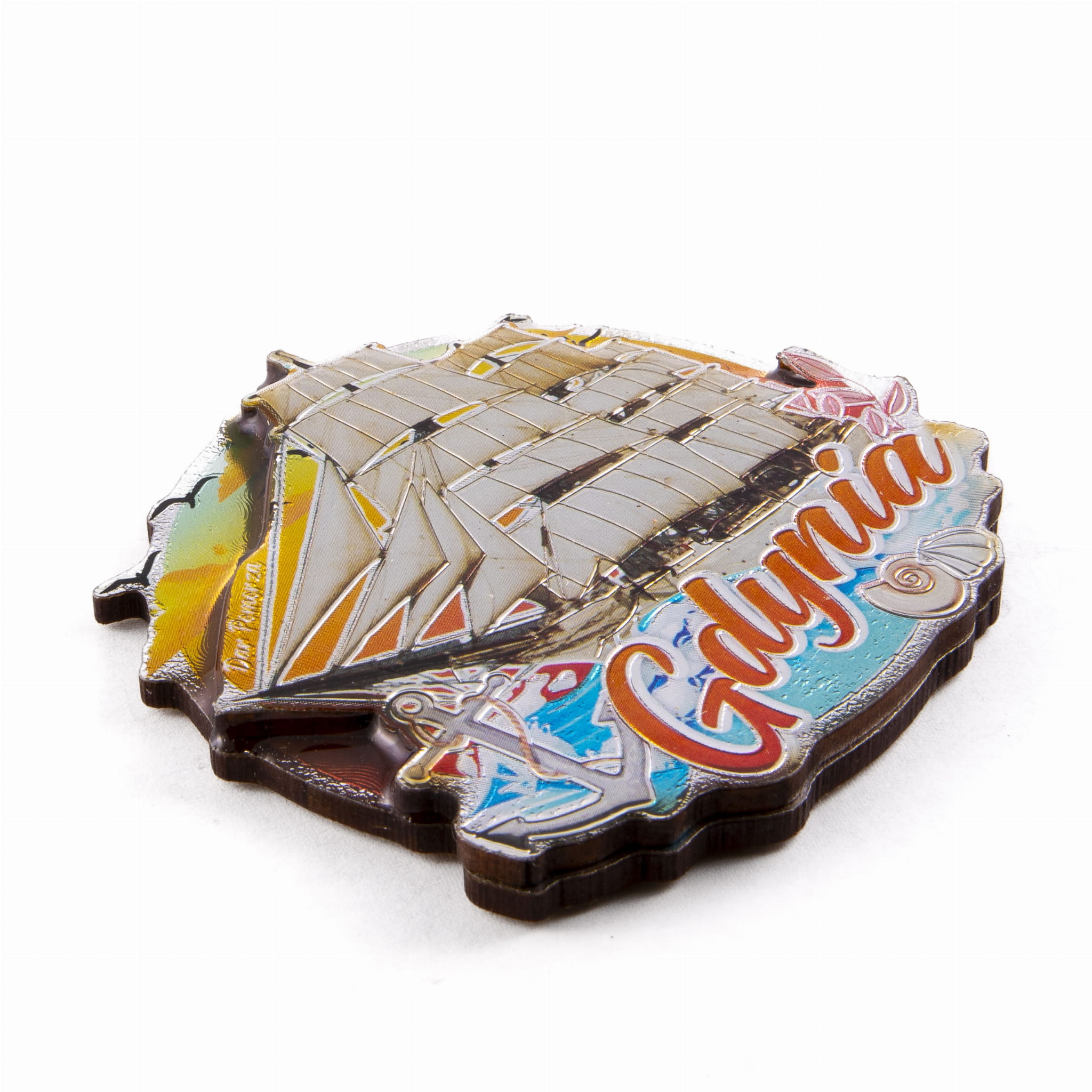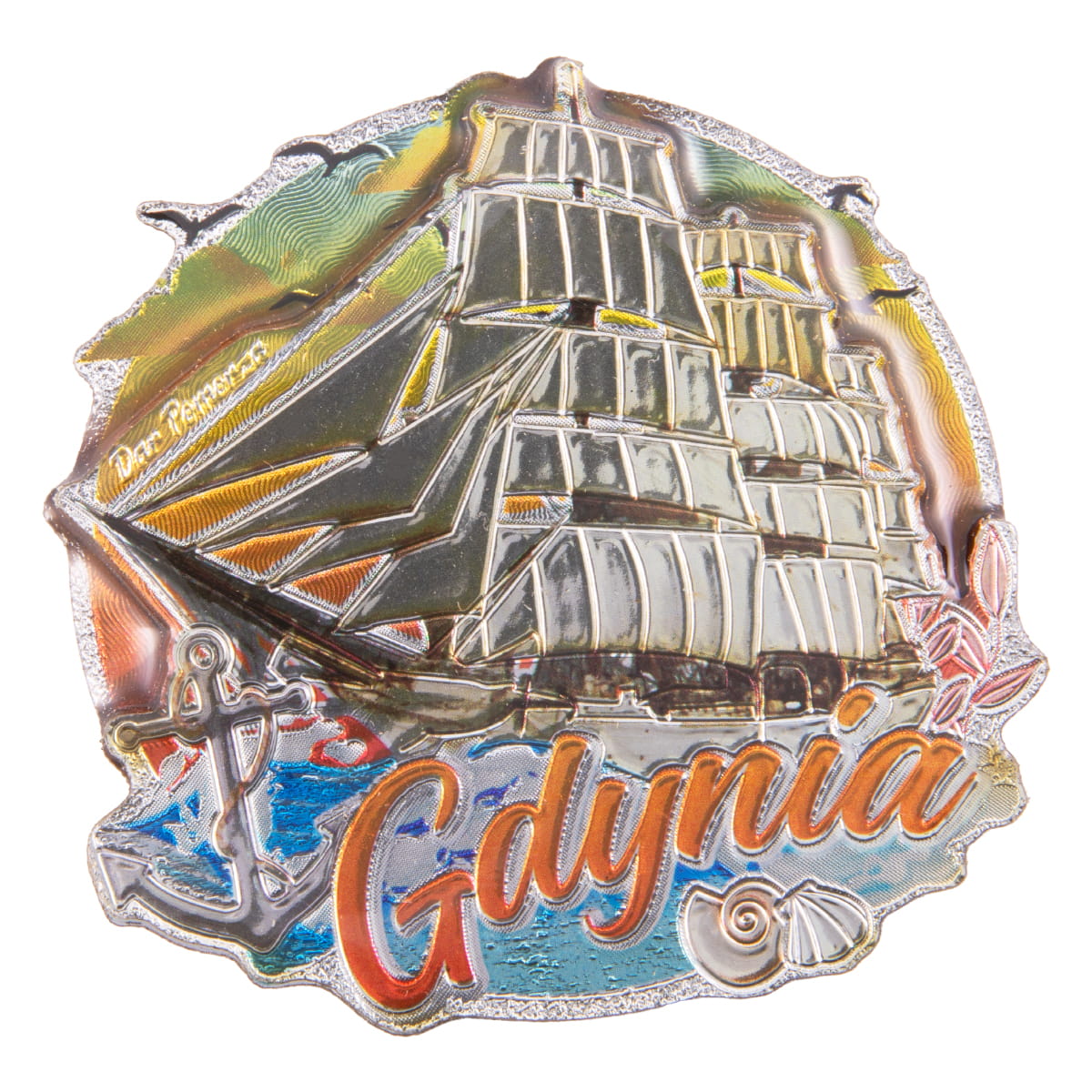 Wykonany z MDF dwuwarstwowy magnes metalizowany, przedstawiający statek-muzeum "Dar Pomorza". Widoczny jest na nim też wyraźny napis "Gdynia". Front magnesu zalany jest żywicą epoksydową zapewniającą trwałość kolorów i nadającą połysk. Na rewersie umieszczona jest duża, wysokiej klasy folia magnetyczna zapewniająca trwałe, bezpieczne umocowanie pamiątki na metalowej powierzchni.