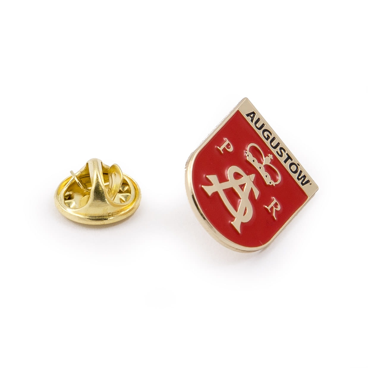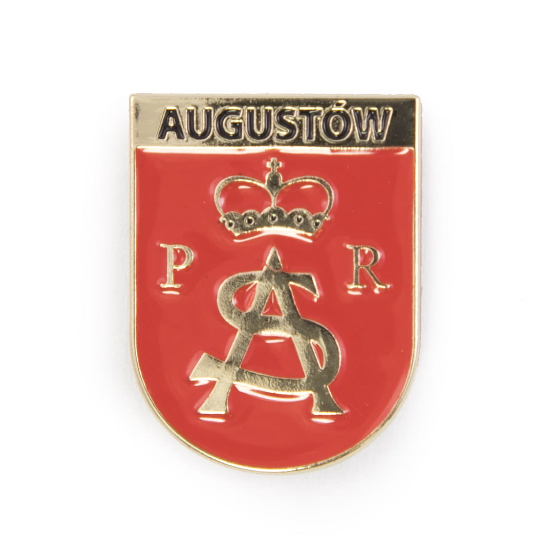 Wysokiej jakości metalowa przypinka prezentująca herb miasta Augustów.