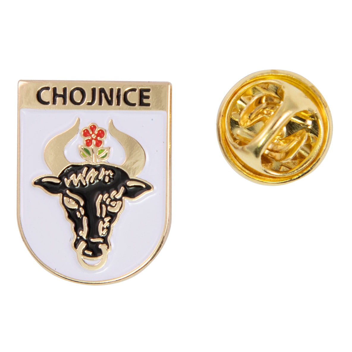 Wysokiej jakości metalowa przypinka prezentująca herb miasta Chojnice.