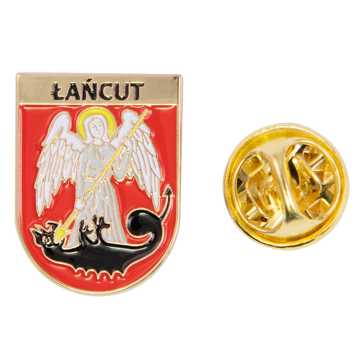 Wysokiej jakości metalowa przypinka prezentująca herb miasta Łańcuta.