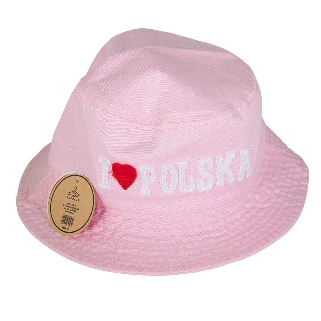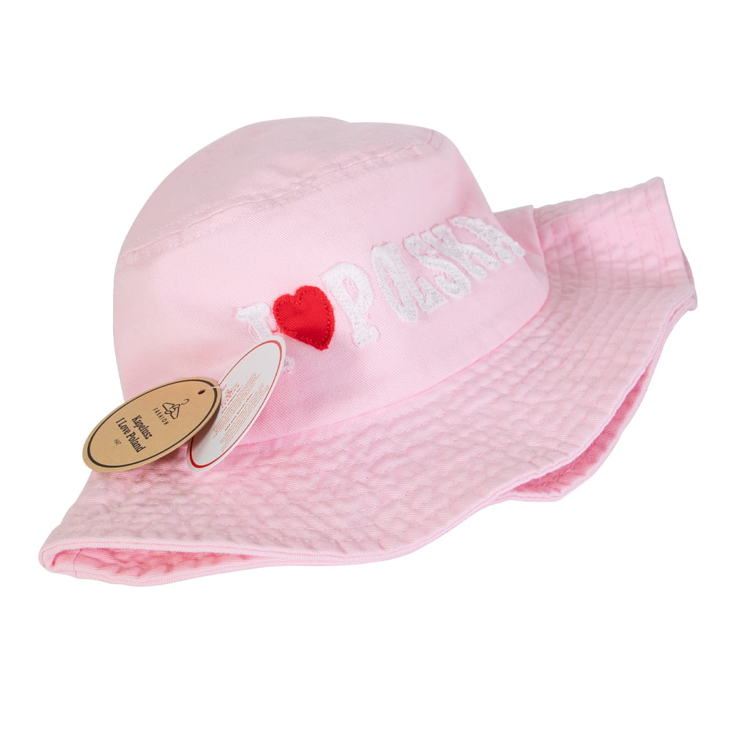 Różowy, bawełniany kapelusz wiaderkowy w charakterystycznym kształcie bucket hat z naszytym na froncie napisem "I ❤ Polska". Obwód głowy na który przygotowany został kapelusz to 58cm.
